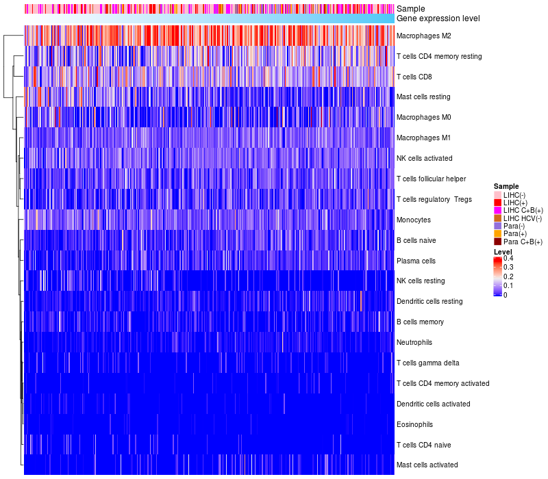 Liver hepatocellular carcinoma HCV (HBV+)(86), Liver hepatocellular carcinoma HCV (HBV-)(19), Liver hepatocellular carcinoma (HBV+)(209), Liver hepatocellular carcinoma (HBV+)(60), Paracancerous HCV (HBV+)(4), Paracancerous (HBV-)(28), Paracancerous (HBV+)(18) |