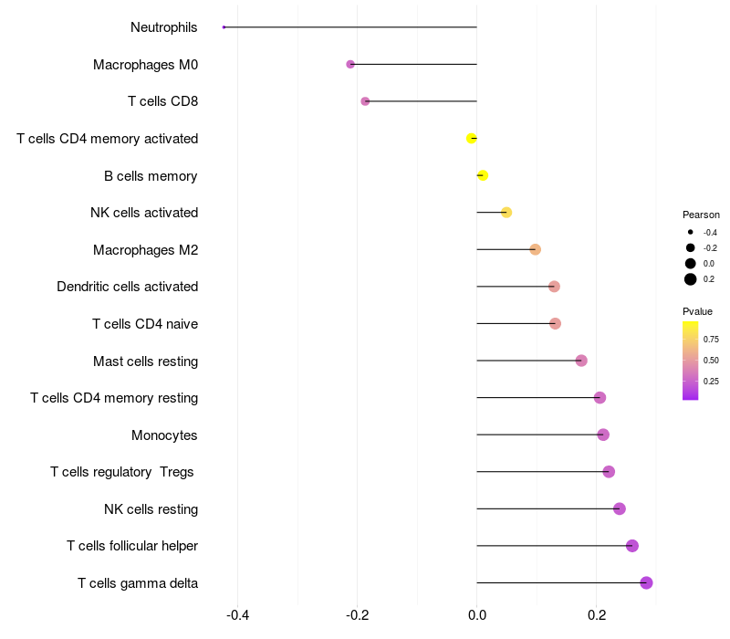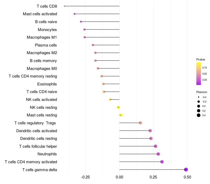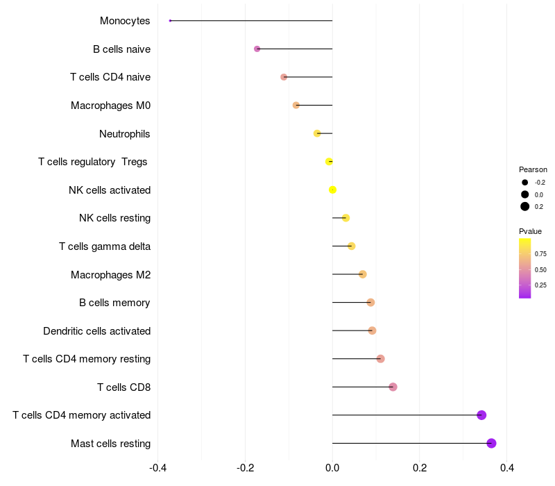 Lollipop of PLAT expression and immune infiltrating cell level correlation result in HTLV1+ samples