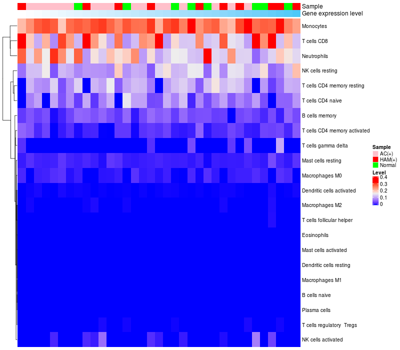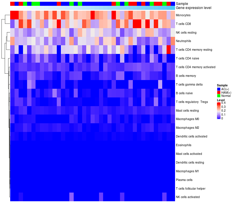 Normal (8), Asymptomatic carriers (HTLV1+)(17), HTLV-1-associated myelopathy (HTLV1+)(10) |