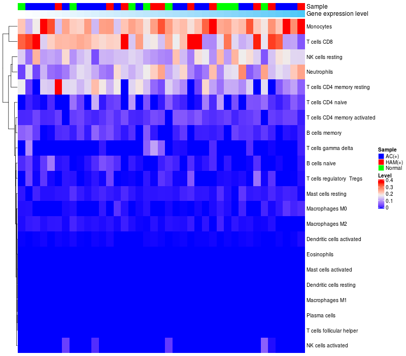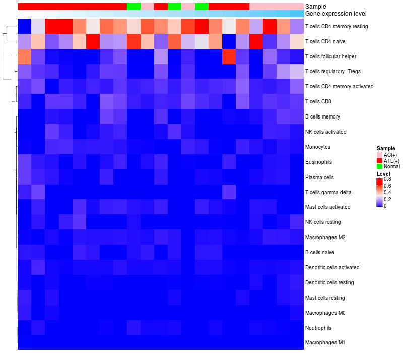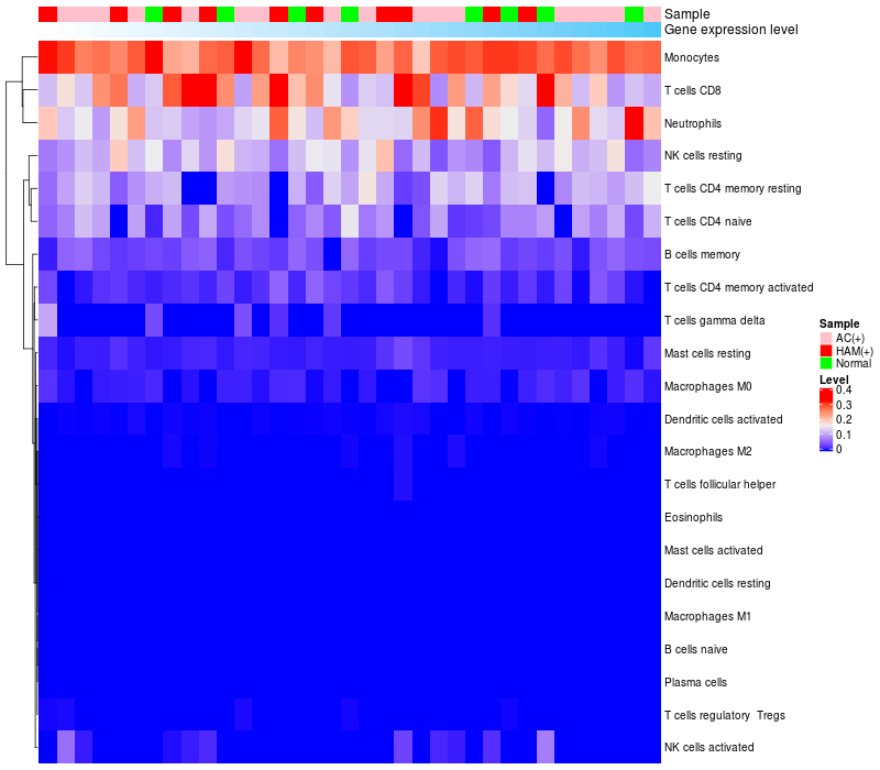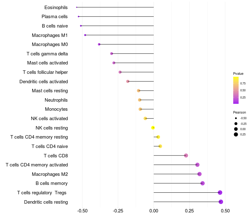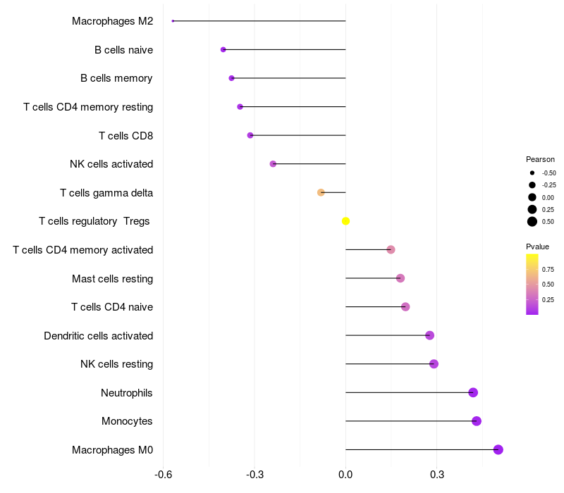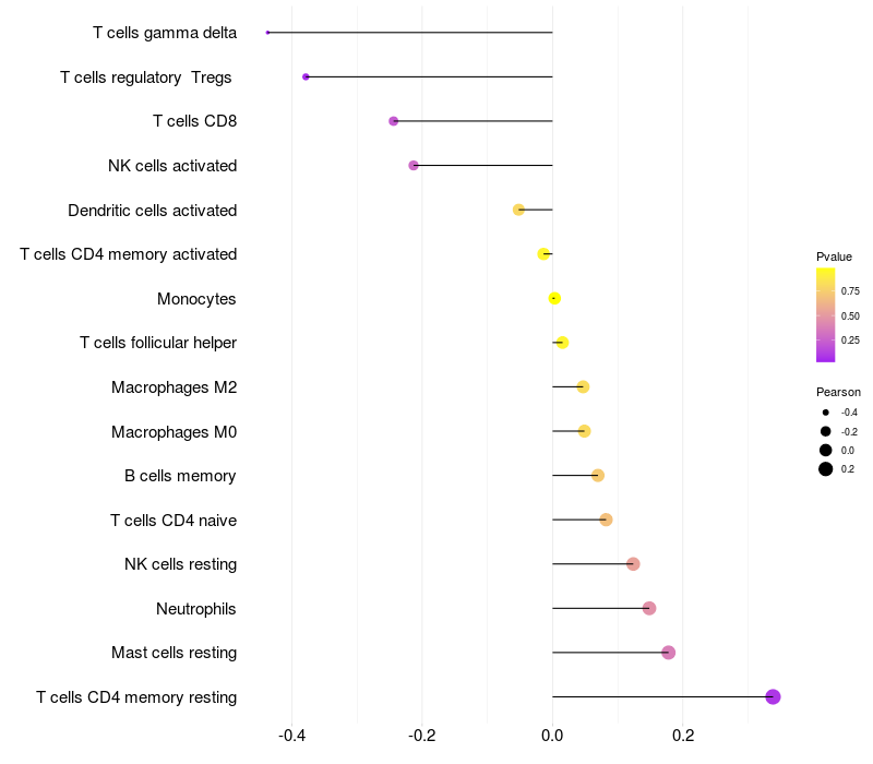 Lollipop of PLCB2 expression and immune infiltrating cell level correlation result in HTLV1+ samples