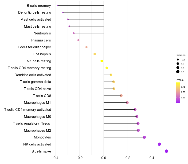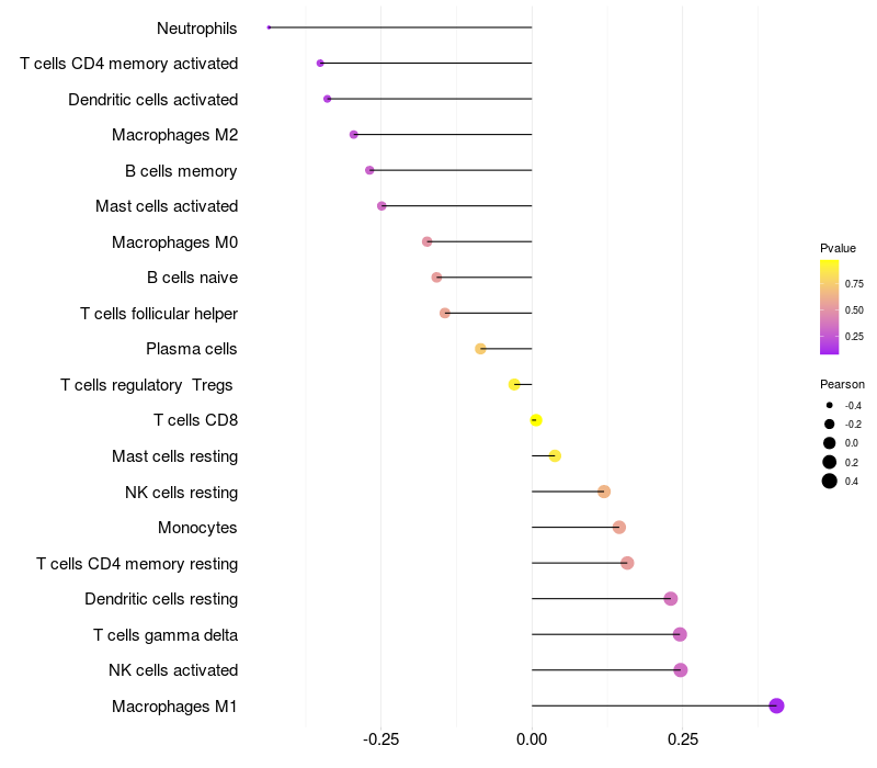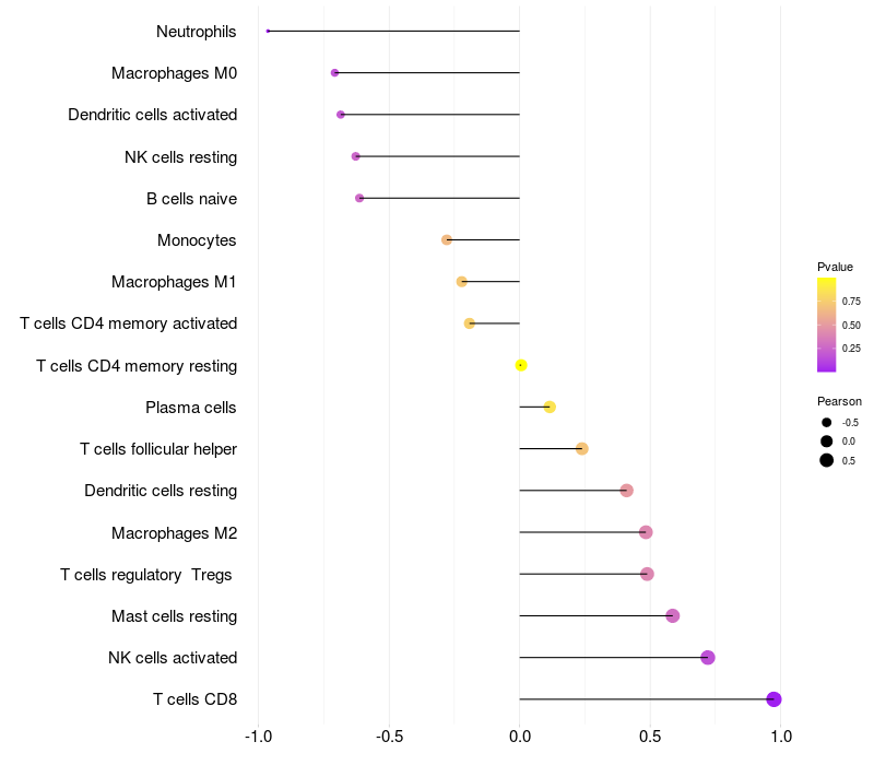 Lollipop of PLCXD2 expression and immune infiltrating cell level correlation result in HPV+ samples
