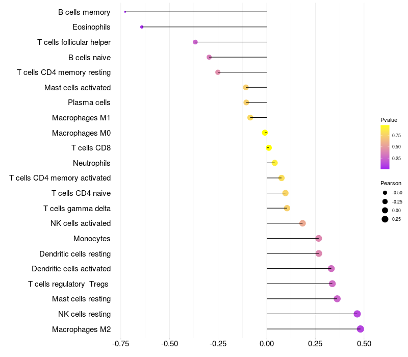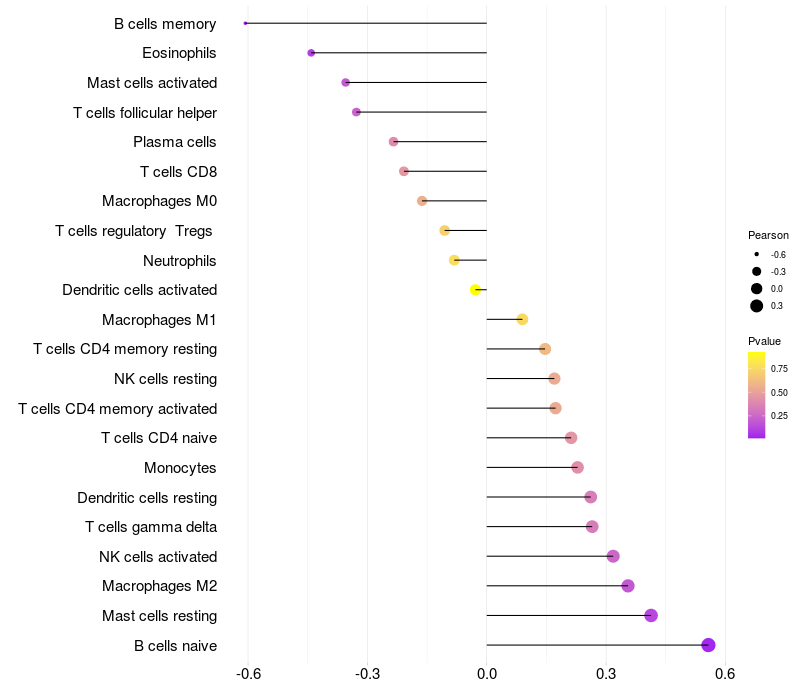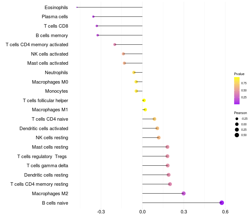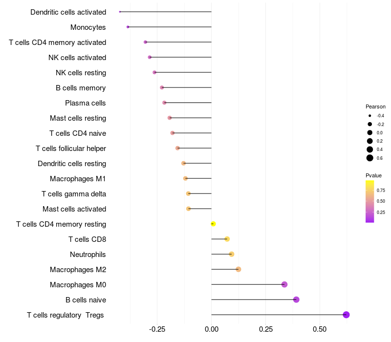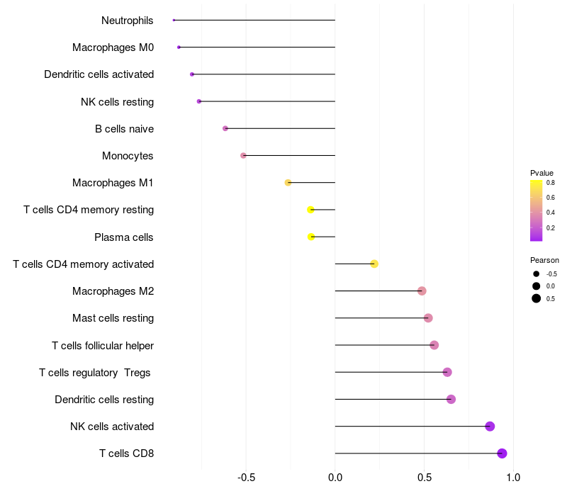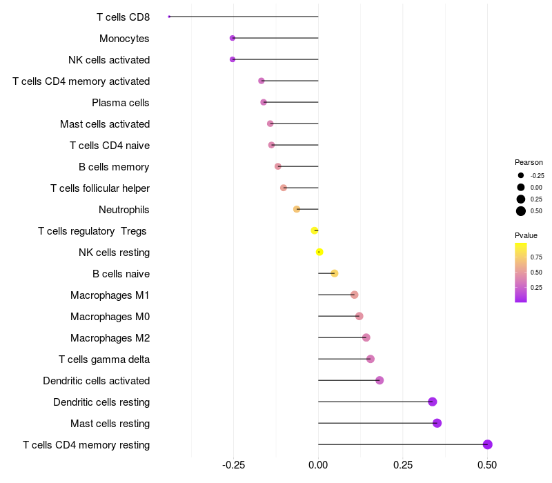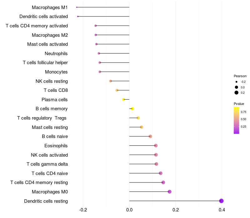 Lollipop of PLEKHM3 expression and immune infiltrating cell level correlation result in HPV+ samples