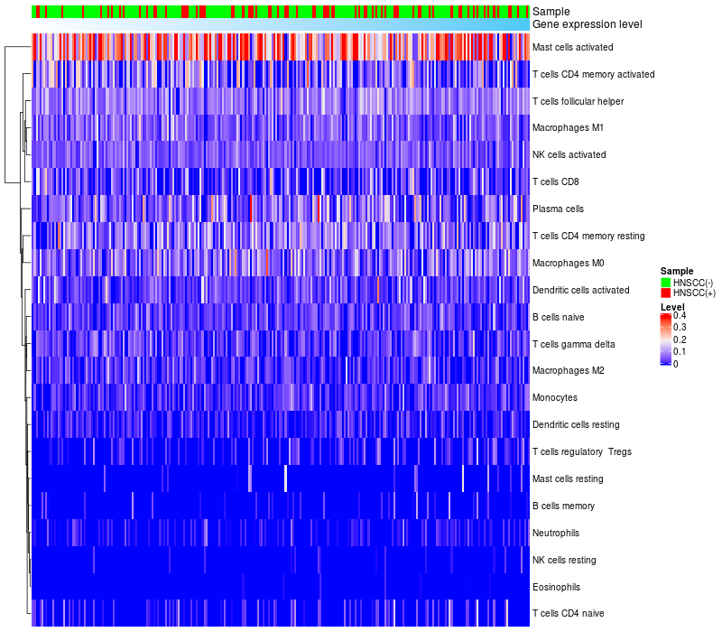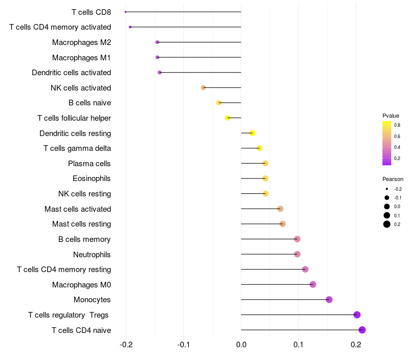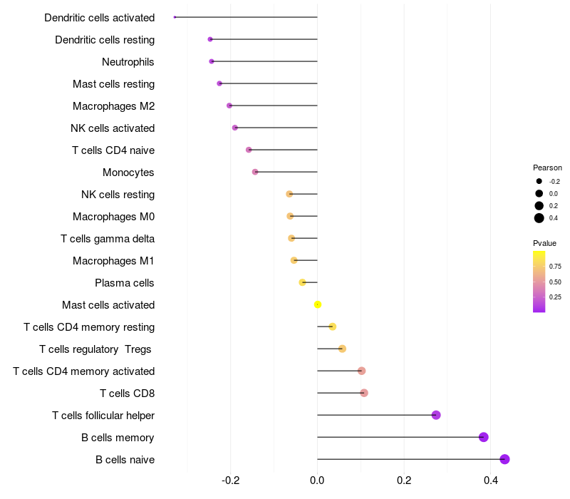 Lollipop of PLGLB2 expression and immune infiltrating cell level correlation result in HPV+ samples