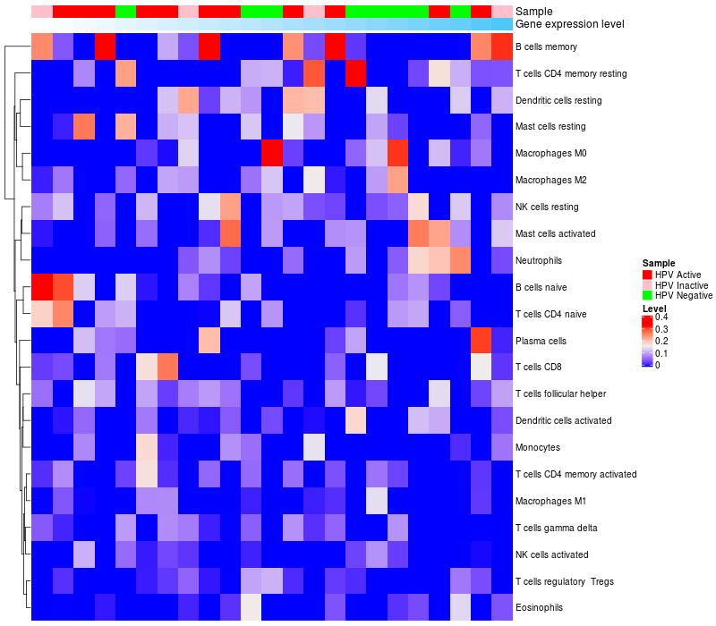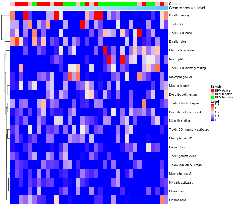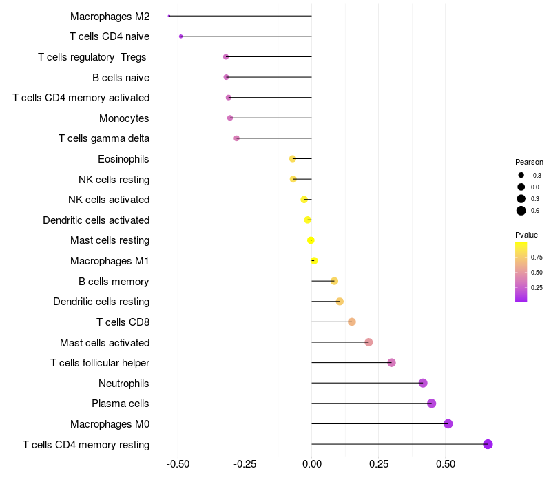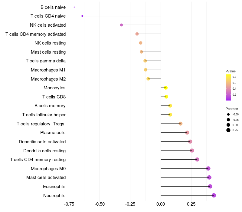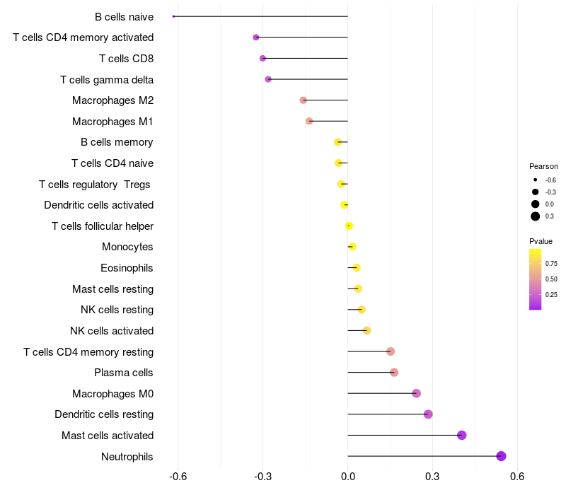Lollipop of PLK2 expression and immune infiltrating cell level correlation result in HPV+ samples