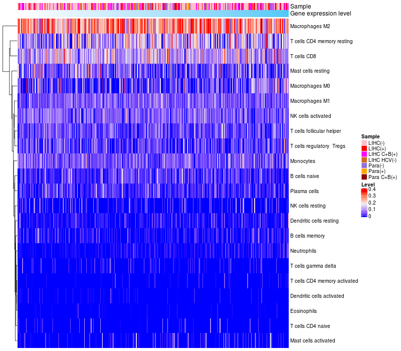 Liver hepatocellular carcinoma HCV (HBV+)(86), Liver hepatocellular carcinoma HCV (HBV-)(19), Liver hepatocellular carcinoma (HBV+)(209), Liver hepatocellular carcinoma (HBV+)(60), Paracancerous HCV (HBV+)(4), Paracancerous (HBV-)(28), Paracancerous (HBV+)(18) |