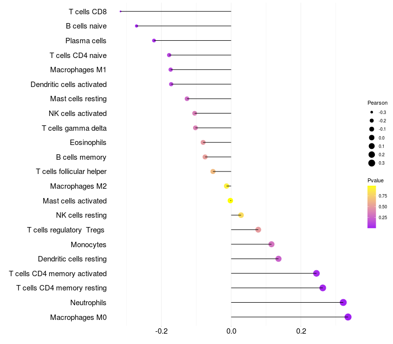 Lollipop of PLOD2 expression and immune infiltrating cell level correlation result in HBV+ samples