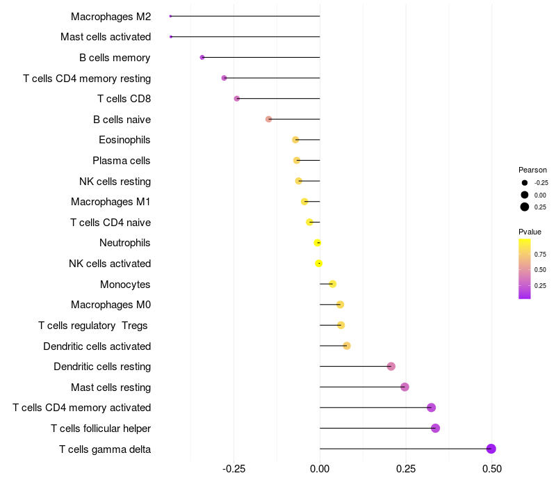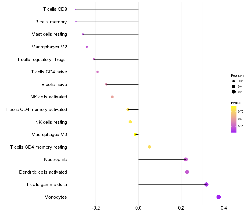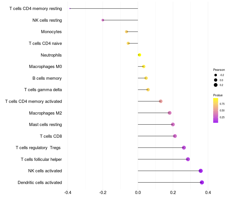 Lollipop of PLSCR2 expression and immune infiltrating cell level correlation result in HTLV1+ samples