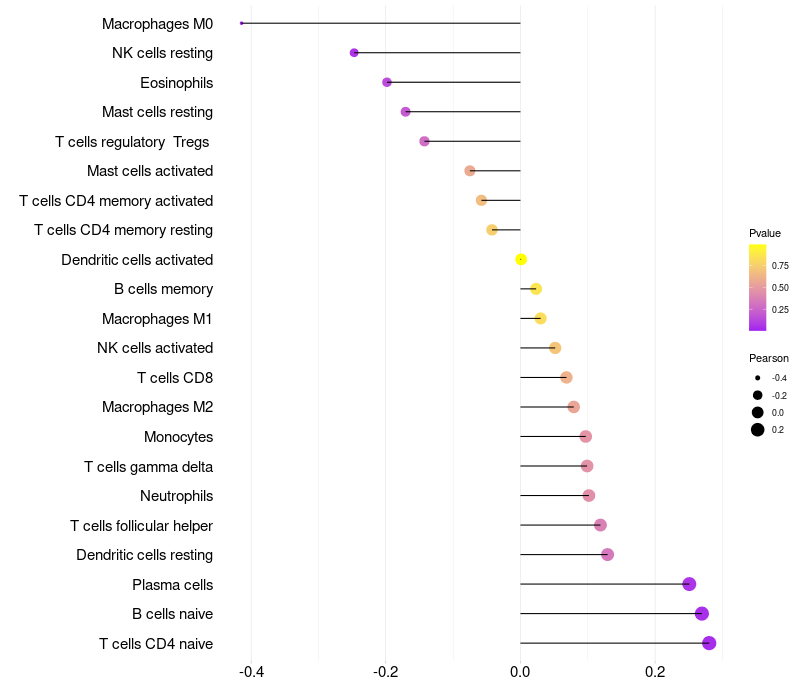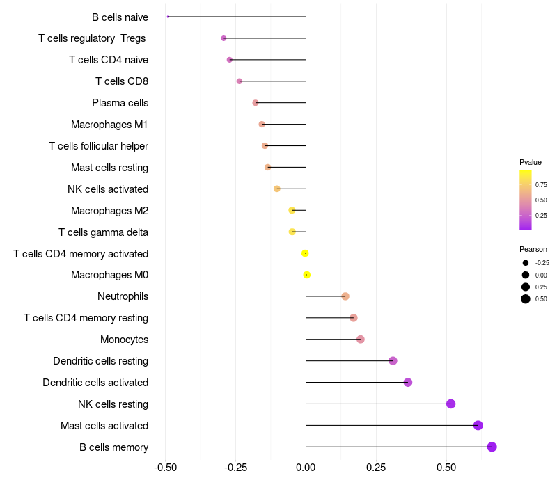 Lollipop of PLSCR4 expression and immune infiltrating cell level correlation result in HPV+ samples