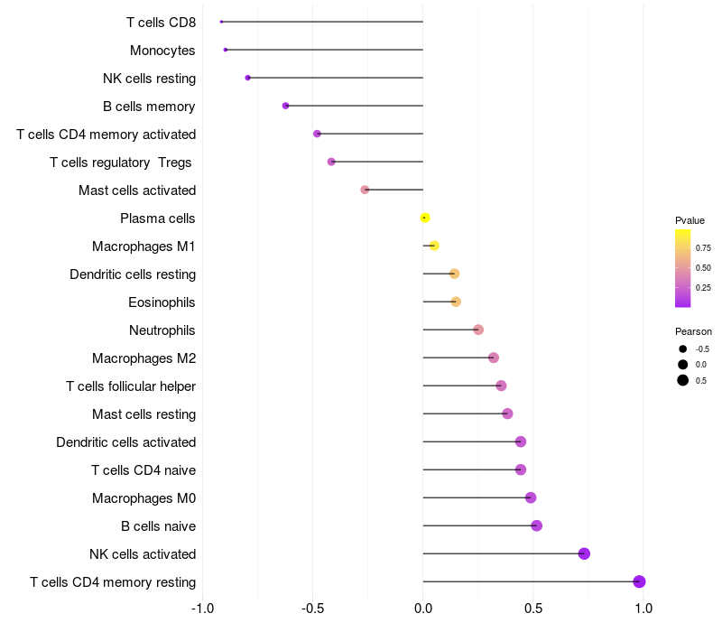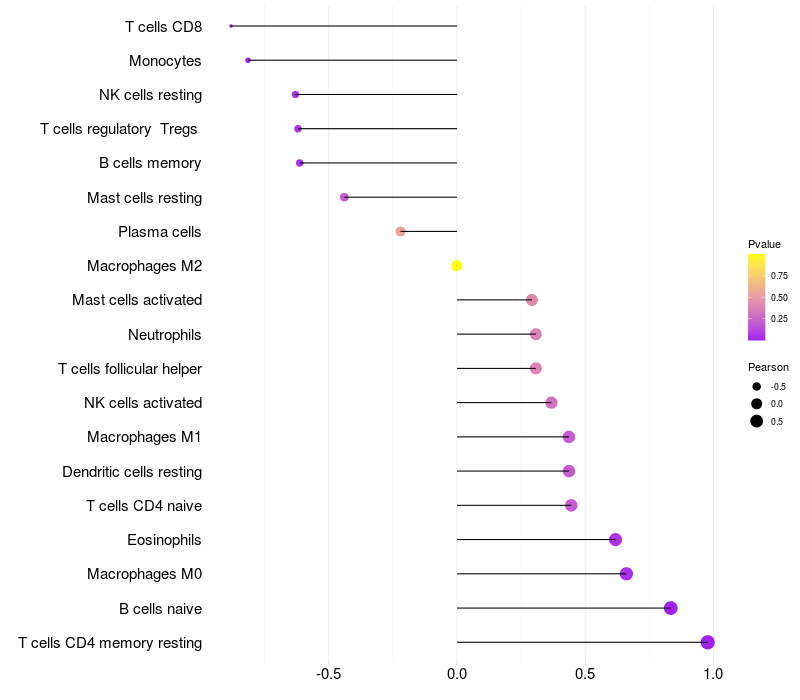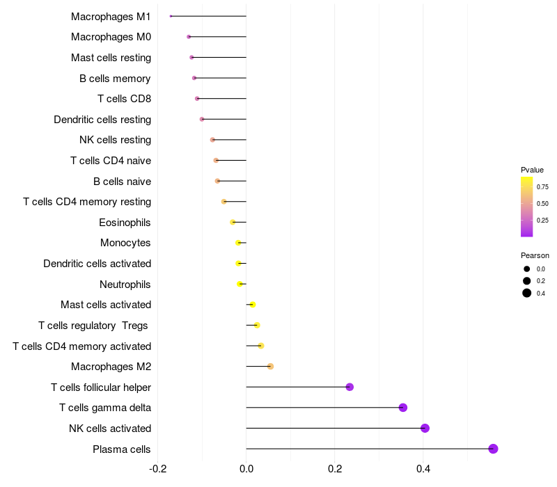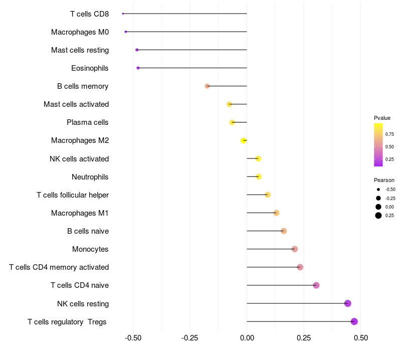 Lollipop of PLTP expression and immune infiltrating cell level correlation result in HBV+ Liver cirrhosis samples