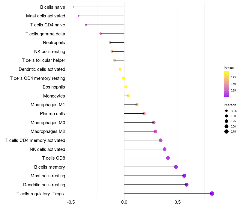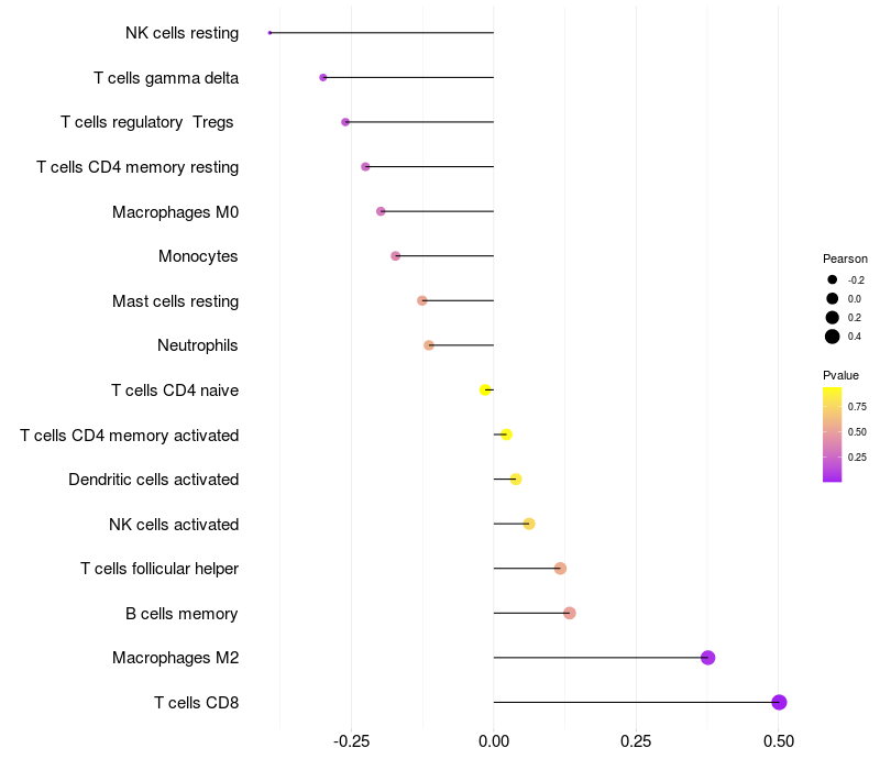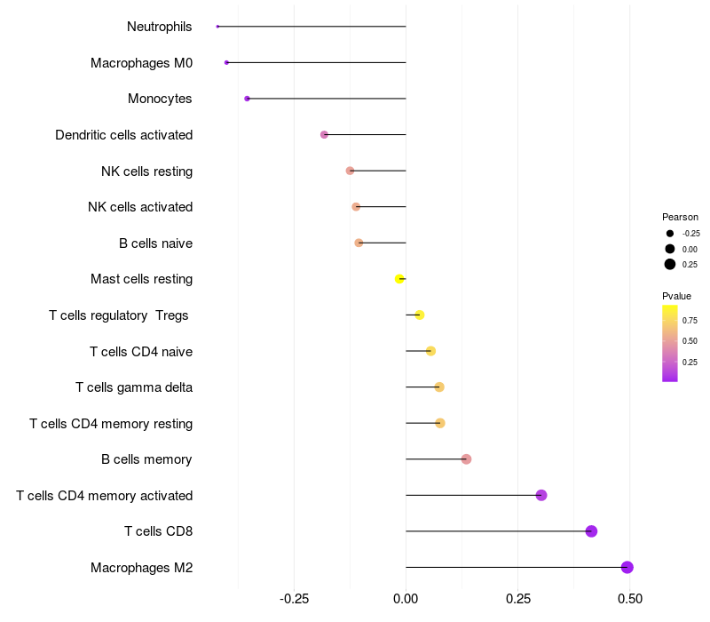 Lollipop of PLXNA1 expression and immune infiltrating cell level correlation result in HTLV1+ samples