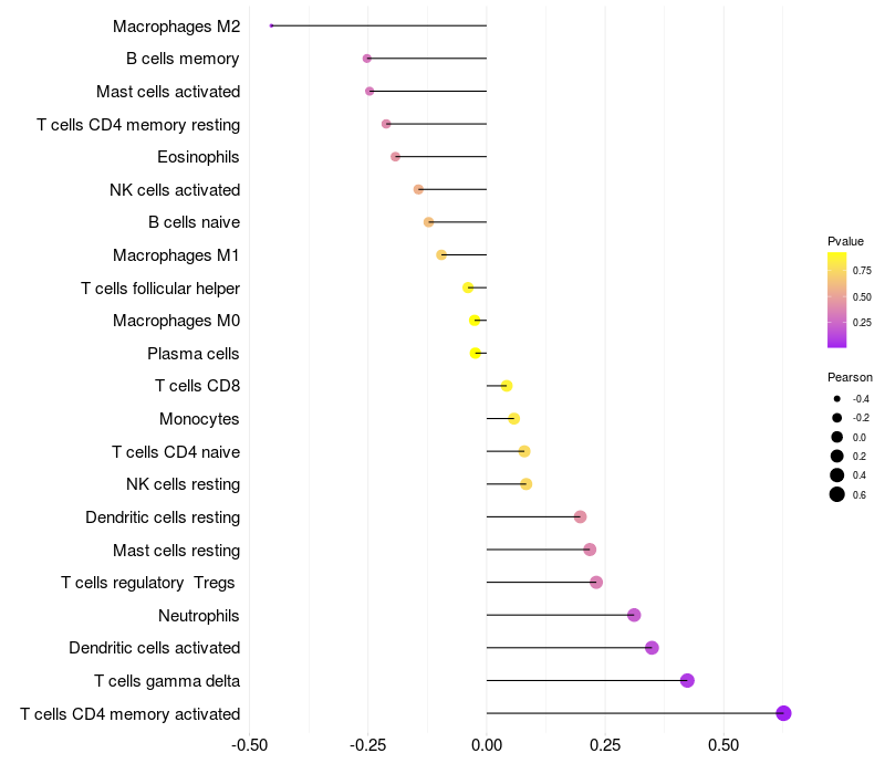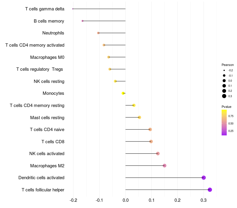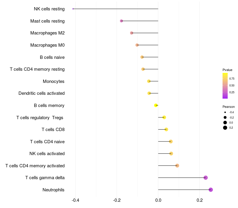 Lollipop of PLXNA2 expression and immune infiltrating cell level correlation result in HTLV1+ samples