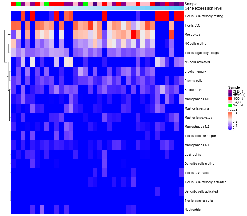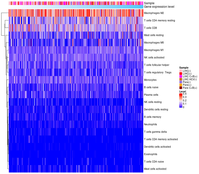 Liver hepatocellular carcinoma HCV (HBV+)(86), Liver hepatocellular carcinoma HCV (HBV-)(19), Liver hepatocellular carcinoma (HBV+)(209), Liver hepatocellular carcinoma (HBV+)(60), Paracancerous HCV (HBV+)(4), Paracancerous (HBV-)(28), Paracancerous (HBV+)(18) |