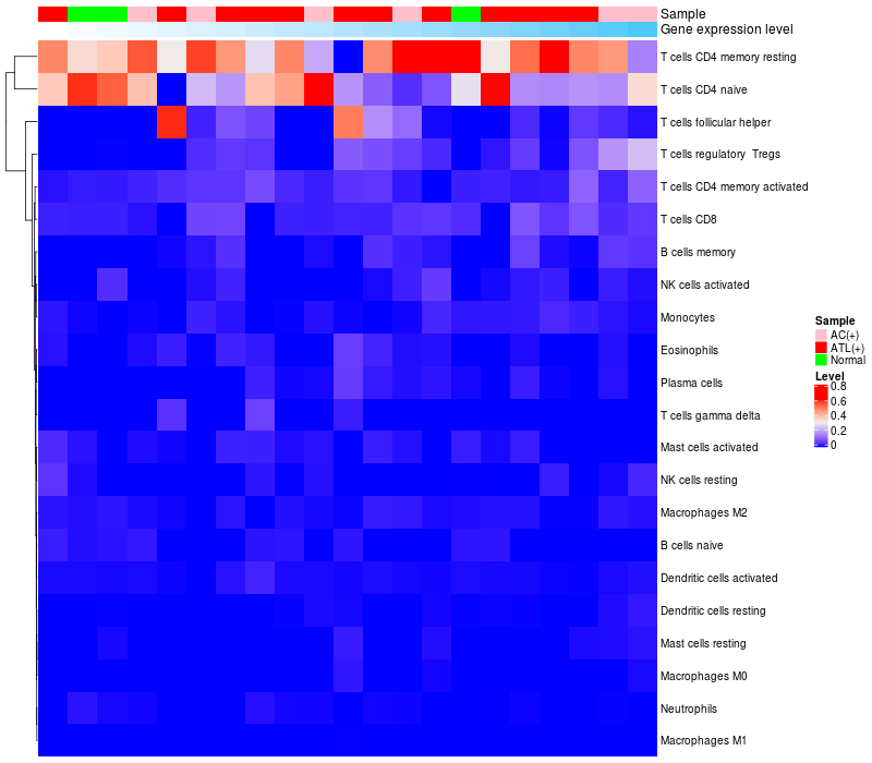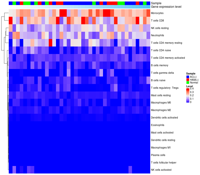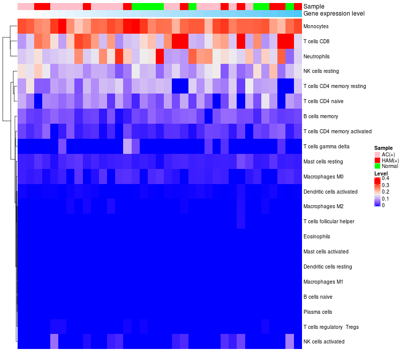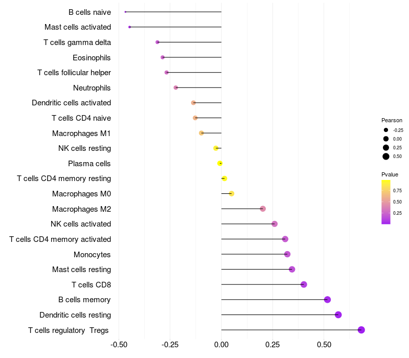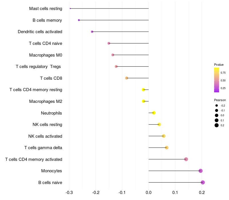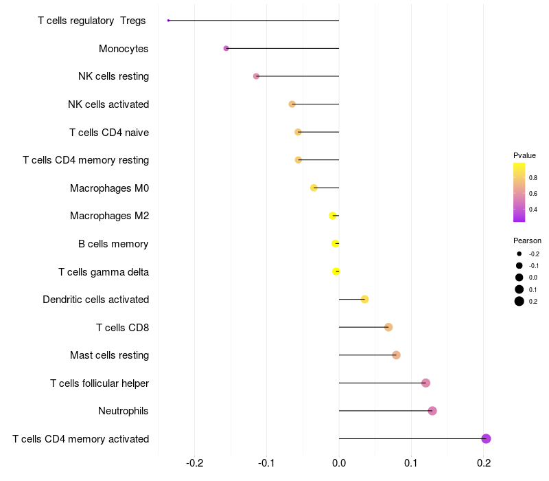 Lollipop of PMFBP1 expression and immune infiltrating cell level correlation result in HTLV1+ samples
