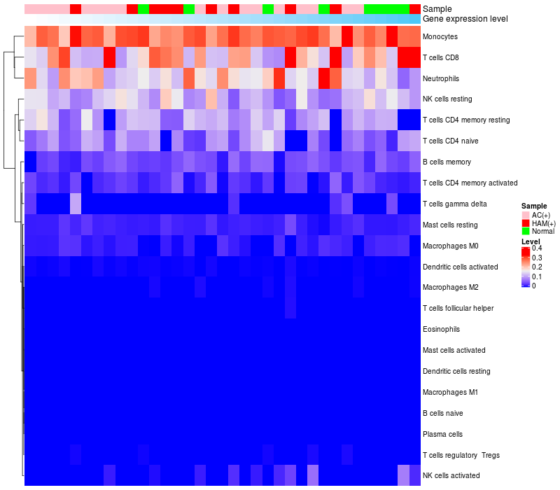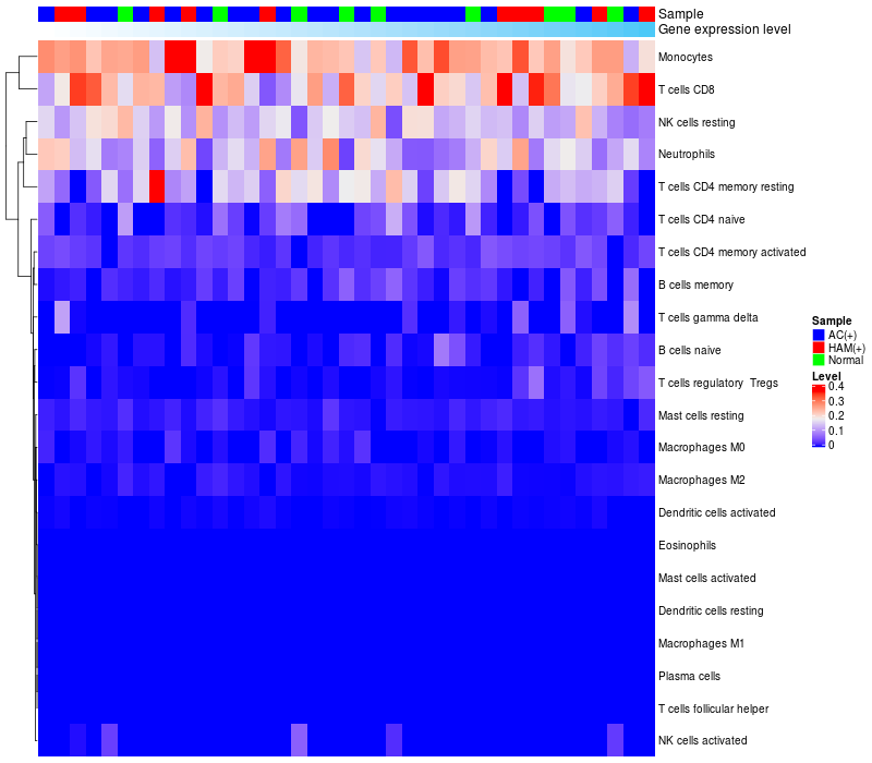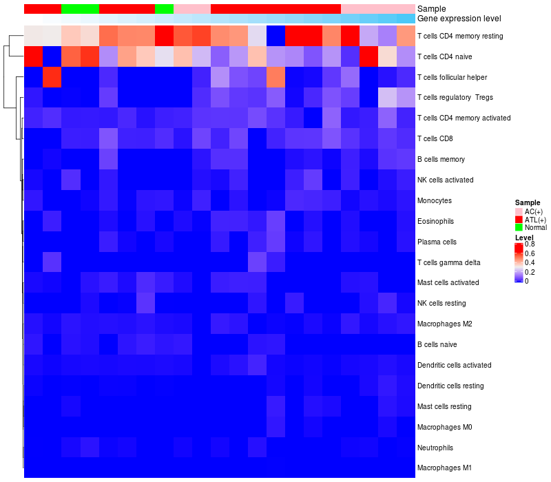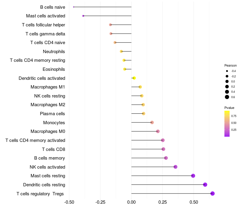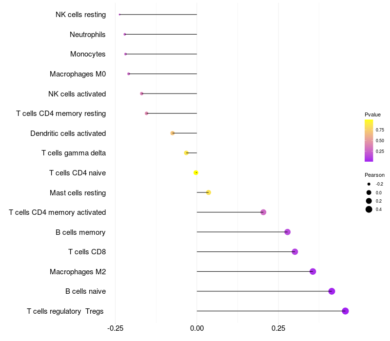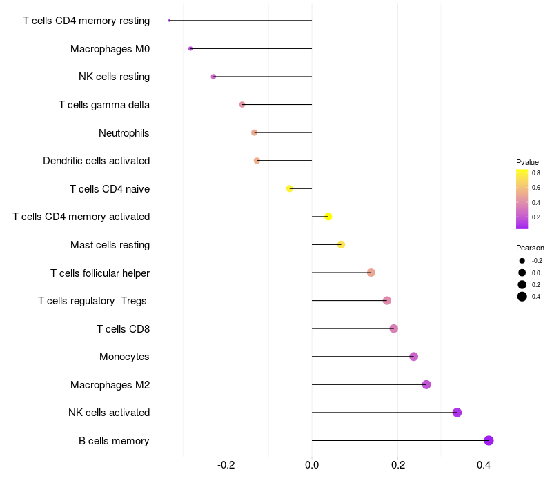 Lollipop of POLDIP3 expression and immune infiltrating cell level correlation result in HTLV1+ samples
