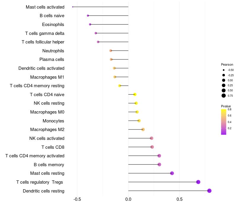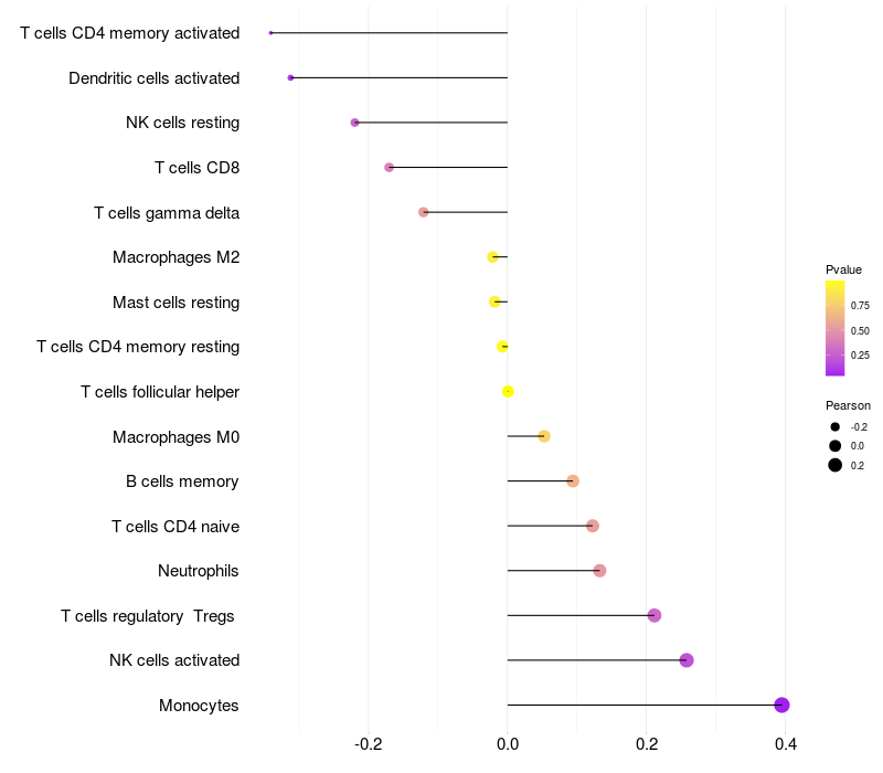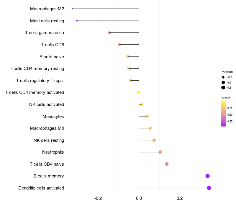 Lollipop of POLM expression and immune infiltrating cell level correlation result in HTLV1+ samples