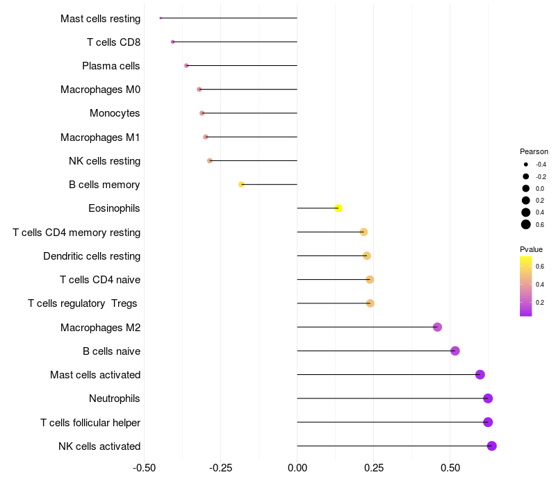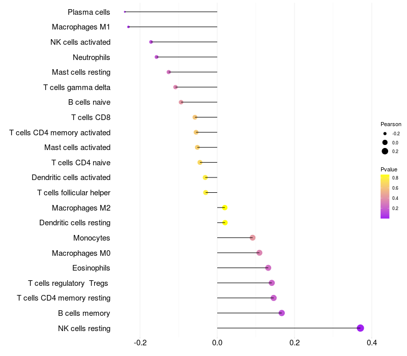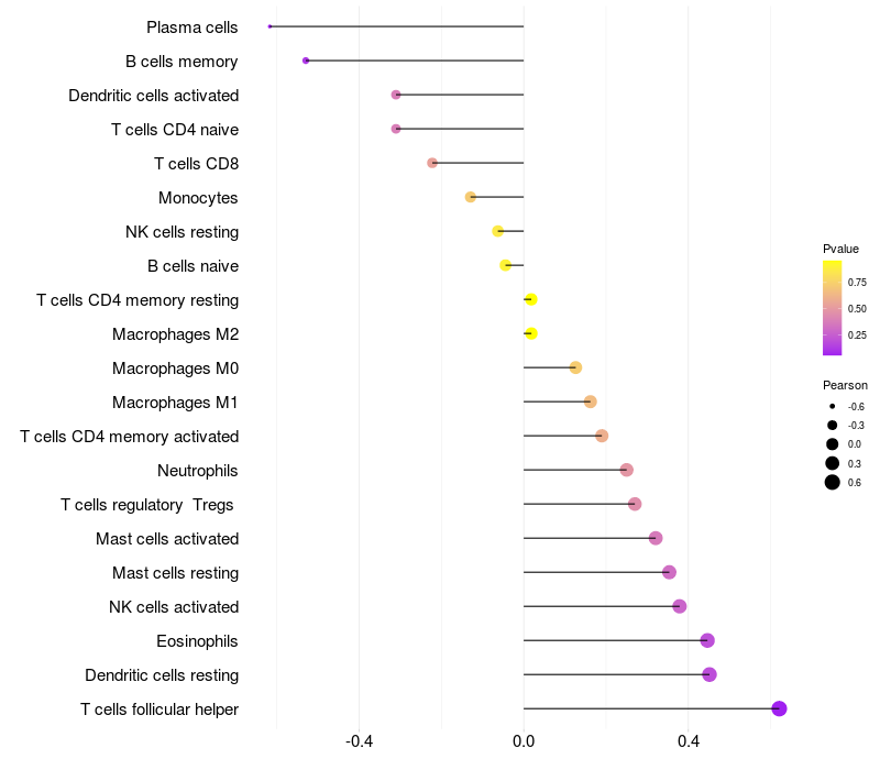 Lollipop of POLR3E expression and immune infiltrating cell level correlation result in HBV+ Chronic HBV (CHB) infection samples