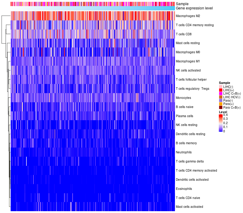 Liver hepatocellular carcinoma HCV (HBV+)(86), Liver hepatocellular carcinoma HCV (HBV-)(19), Liver hepatocellular carcinoma (HBV+)(209), Liver hepatocellular carcinoma (HBV+)(60), Paracancerous HCV (HBV+)(4), Paracancerous (HBV-)(28), Paracancerous (HBV+)(18) |