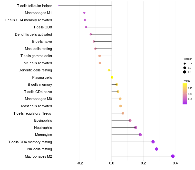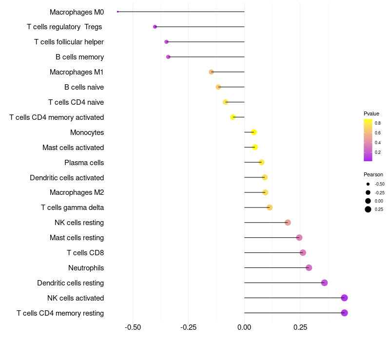 Lollipop of POLR3G expression and immune infiltrating cell level correlation result in HPV+ samples