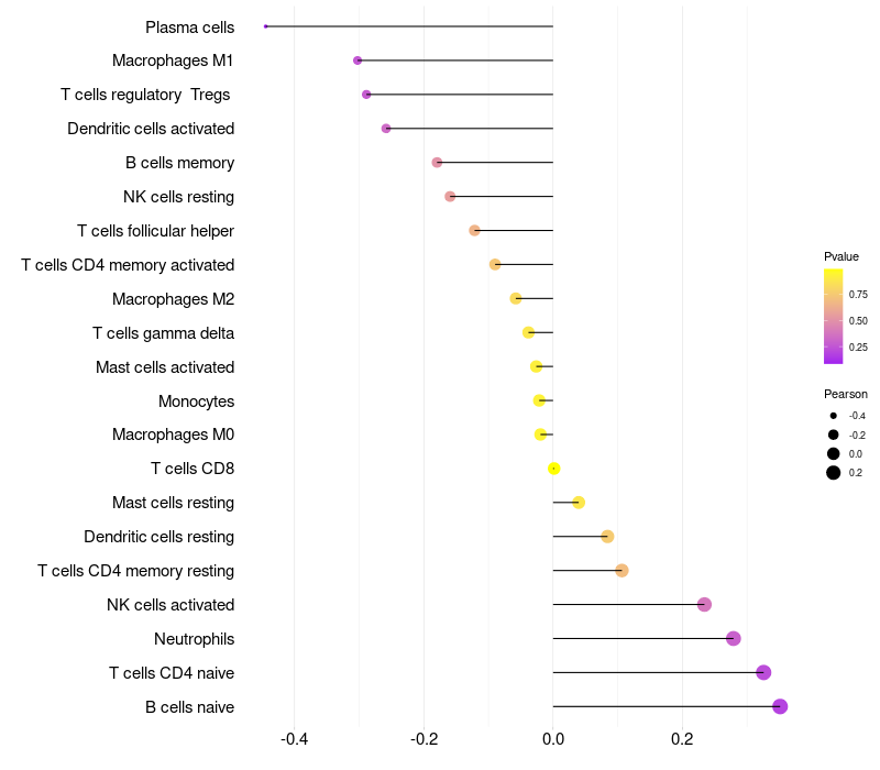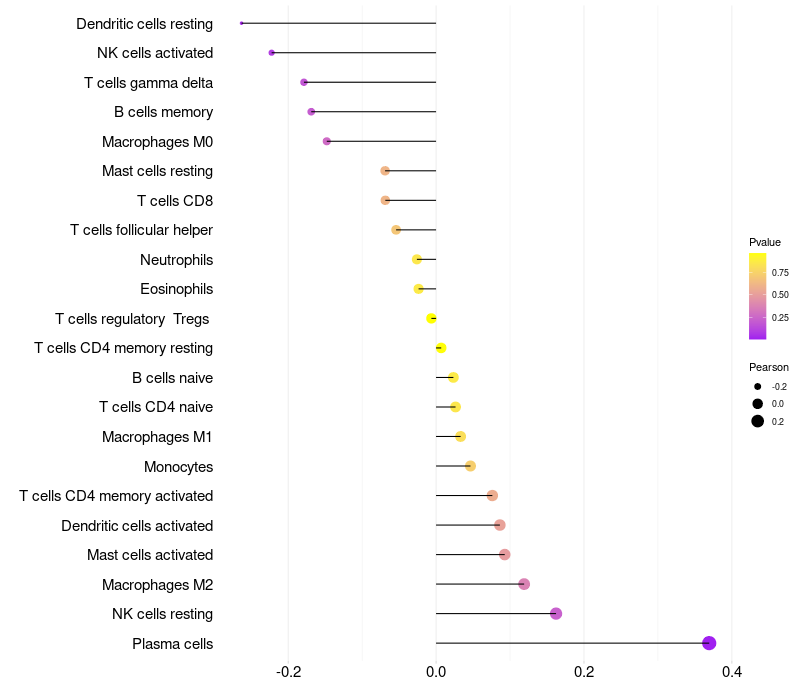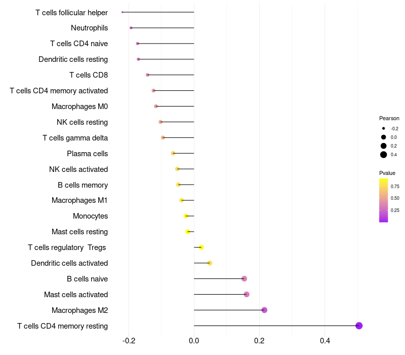 Lollipop of POTEE expression and immune infiltrating cell level correlation result in HPV+ samples