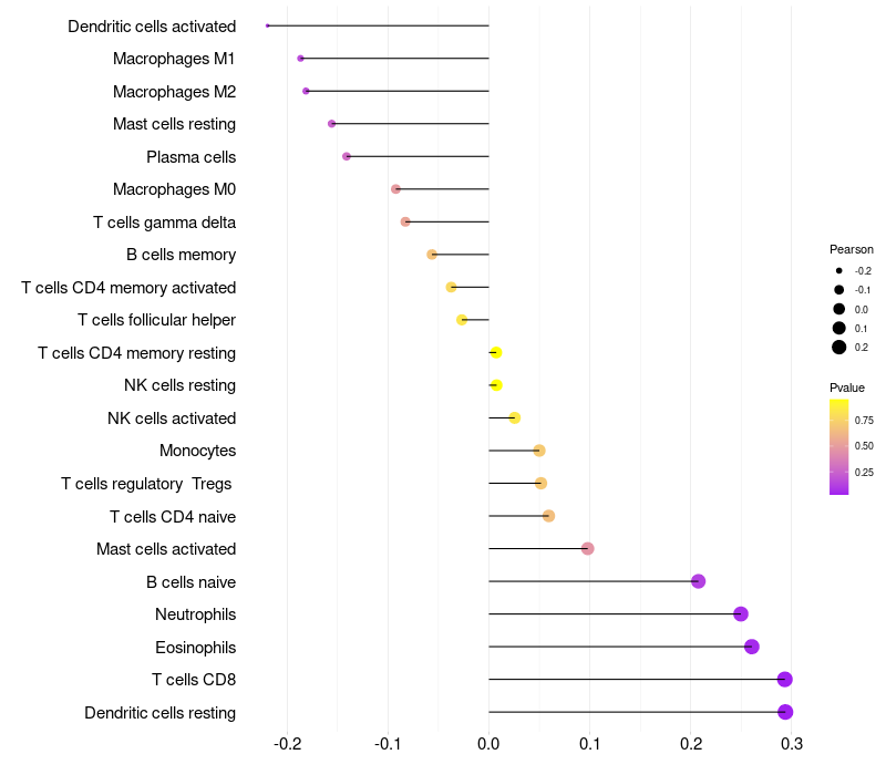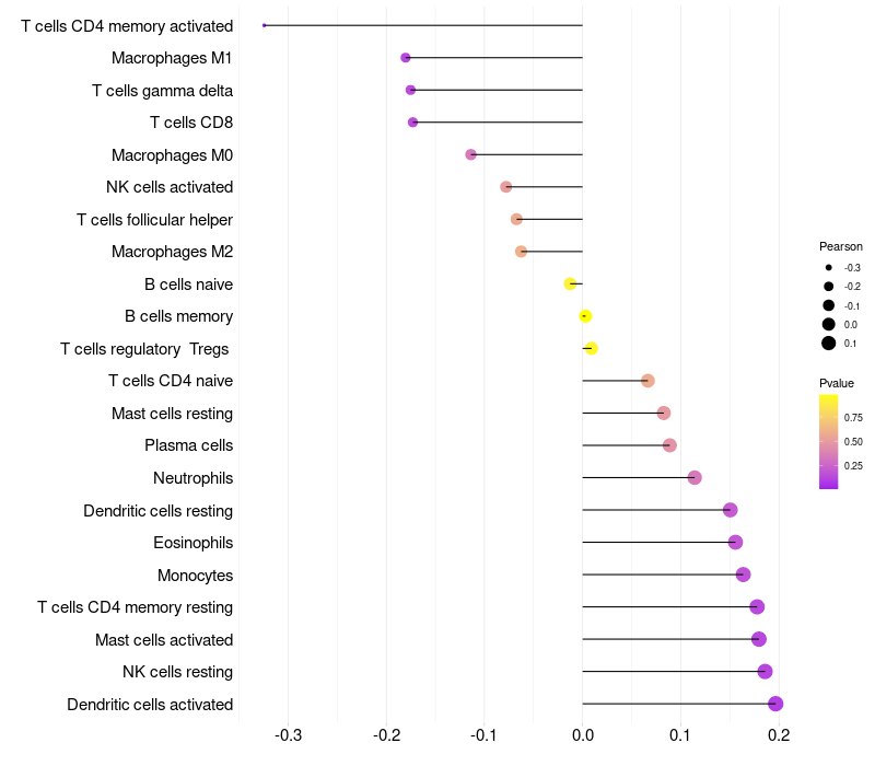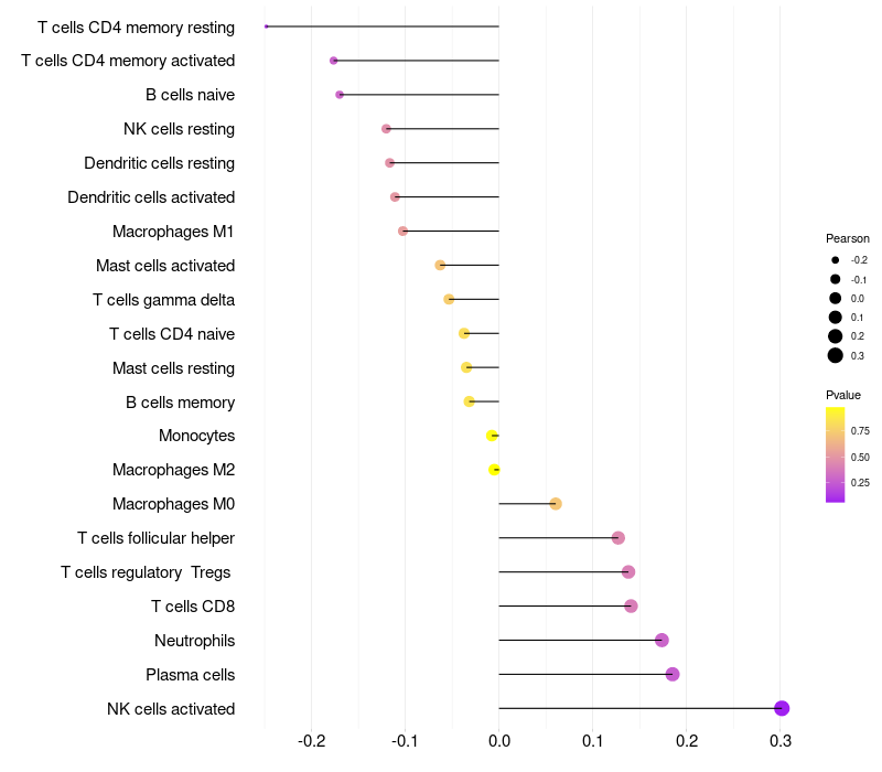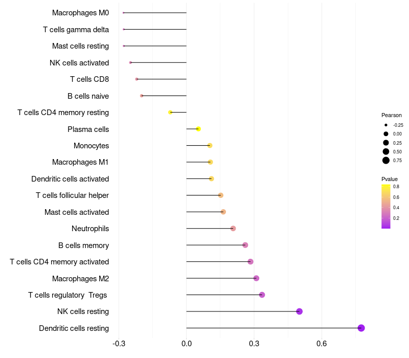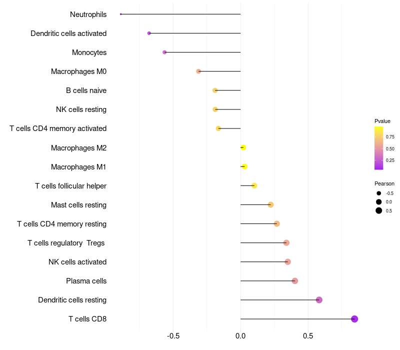 Lollipop of PPDPF expression and immune infiltrating cell level correlation result in HPV+ samples