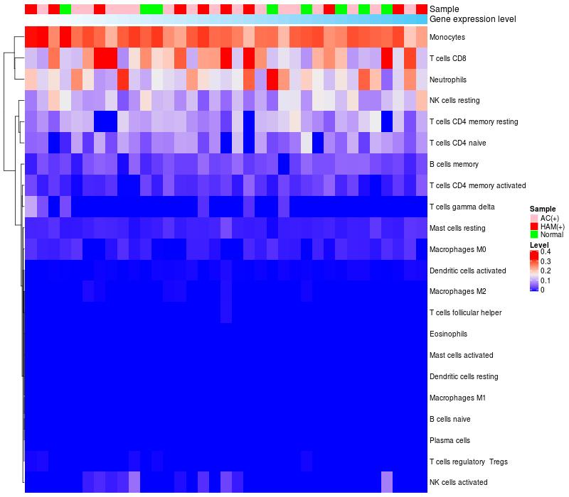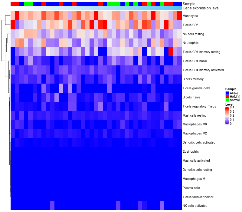 Normal (8), Asymptomatic carriers (HTLV1+)(17), HTLV-1-associated myelopathy (HTLV1+)(10) |