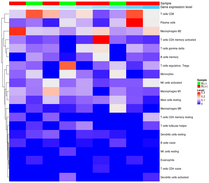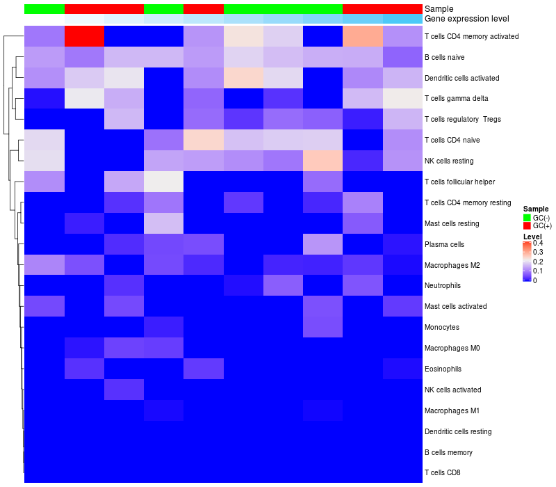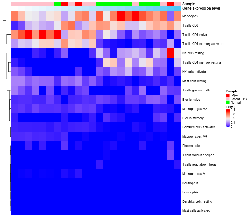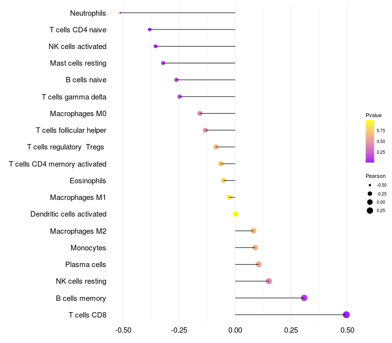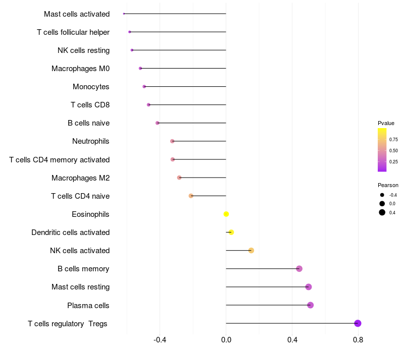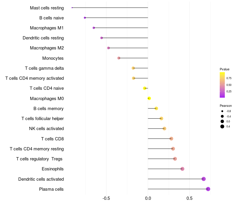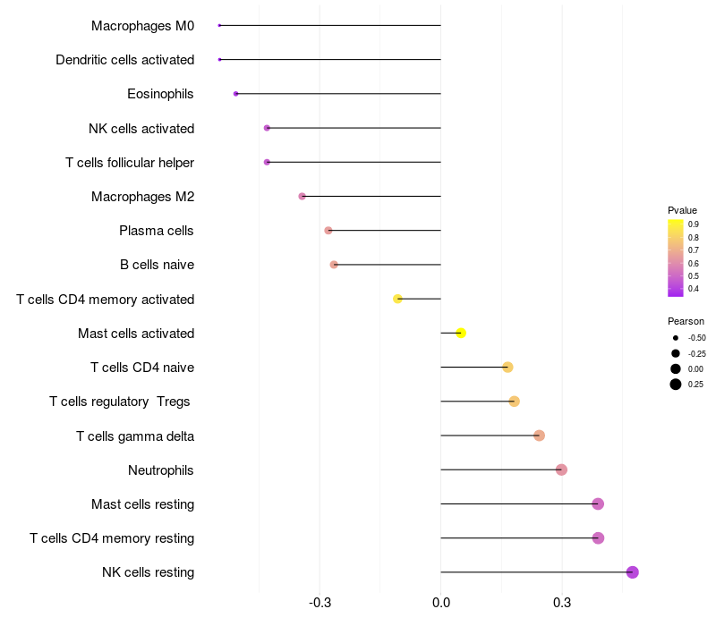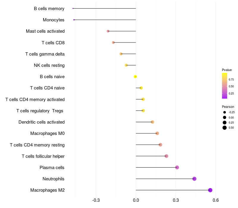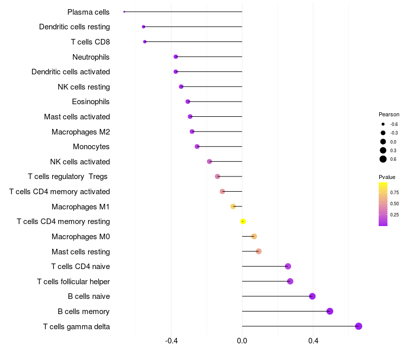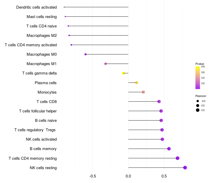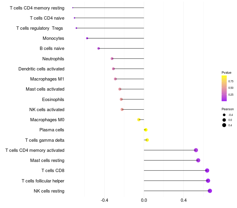 Lollipop of PPP1R16B expression and immune infiltrating cell level correlation result in EBV+ samples