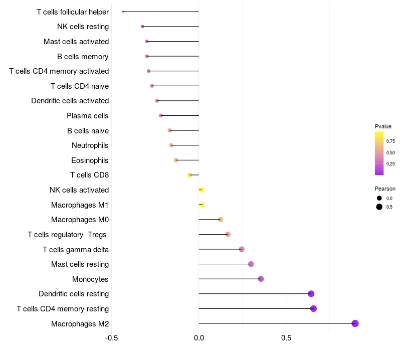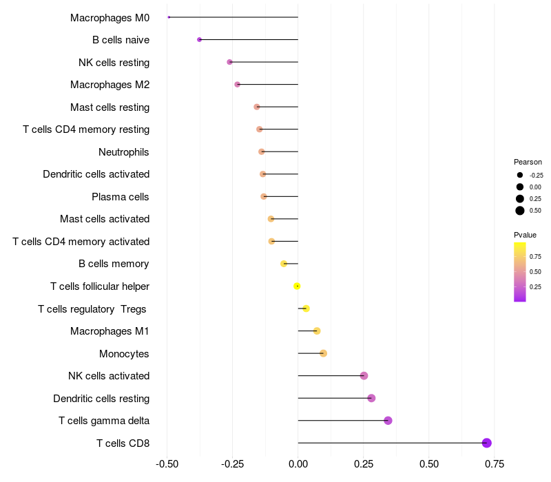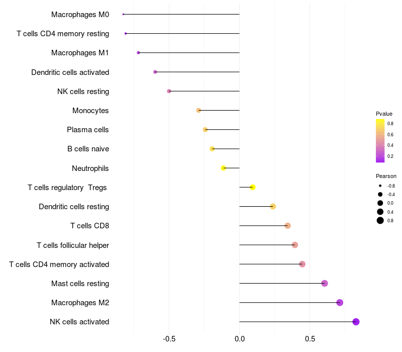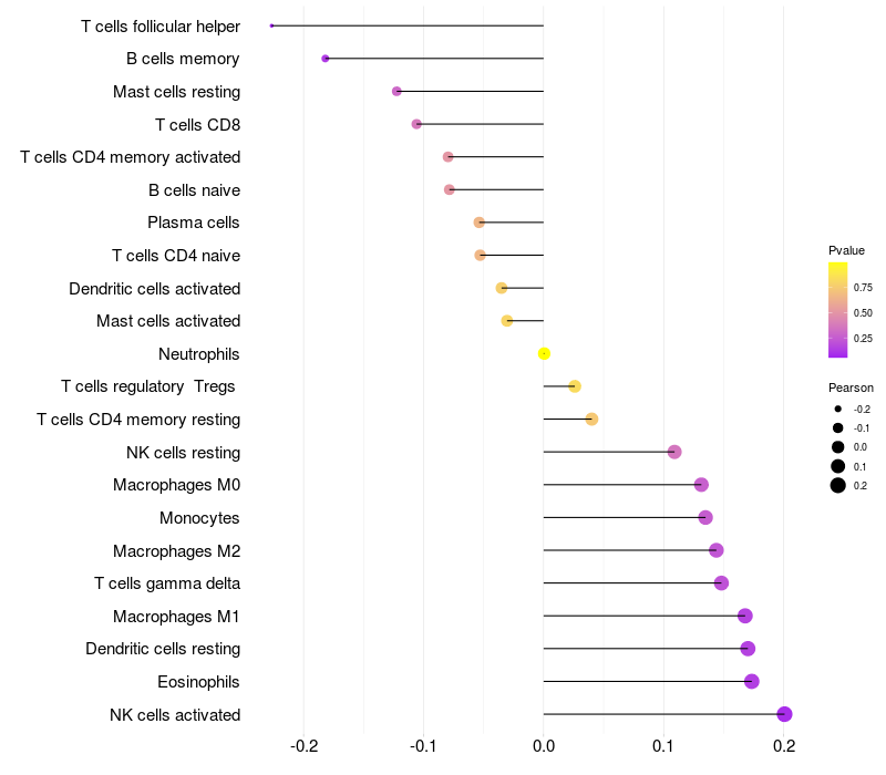 Lollipop of PPP1R3A expression and immune infiltrating cell level correlation result in HPV+ samples