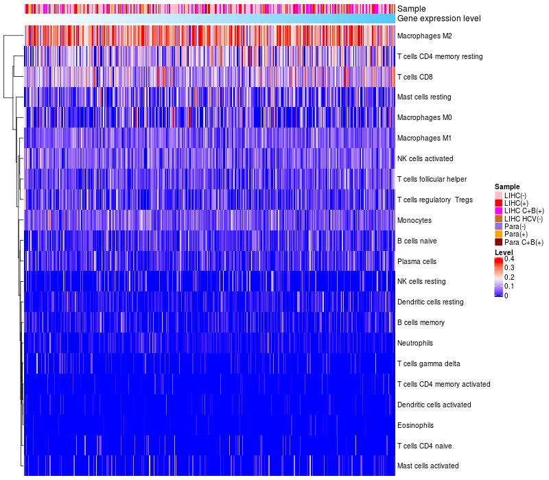 Liver hepatocellular carcinoma HCV (HBV+)(86), Liver hepatocellular carcinoma HCV (HBV-)(19), Liver hepatocellular carcinoma (HBV+)(209), Liver hepatocellular carcinoma (HBV+)(60), Paracancerous HCV (HBV+)(4), Paracancerous (HBV-)(28), Paracancerous (HBV+)(18) |