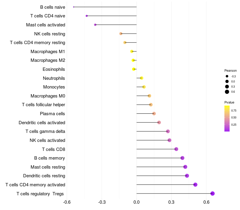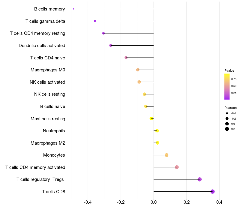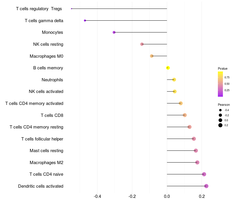 Lollipop of PRDM10 expression and immune infiltrating cell level correlation result in HTLV1+ samples