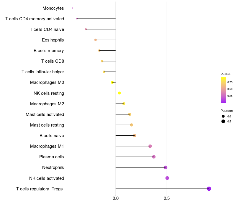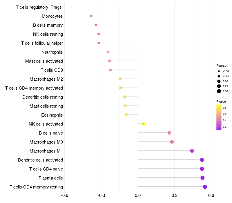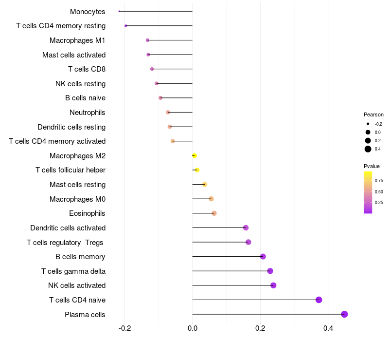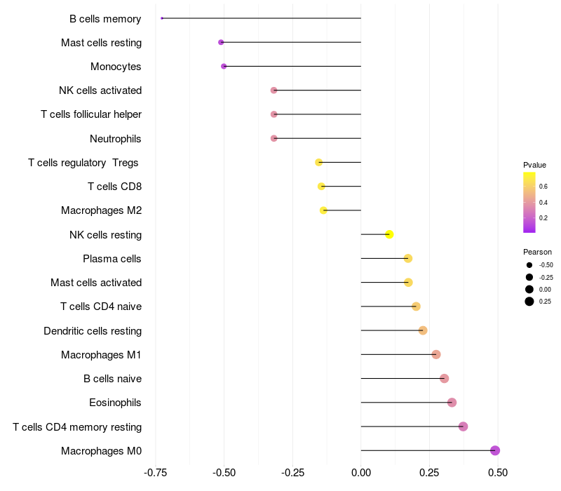 Lollipop of PRDM6 expression and immune infiltrating cell level correlation result in HBV+ Liver cirrhosis samples