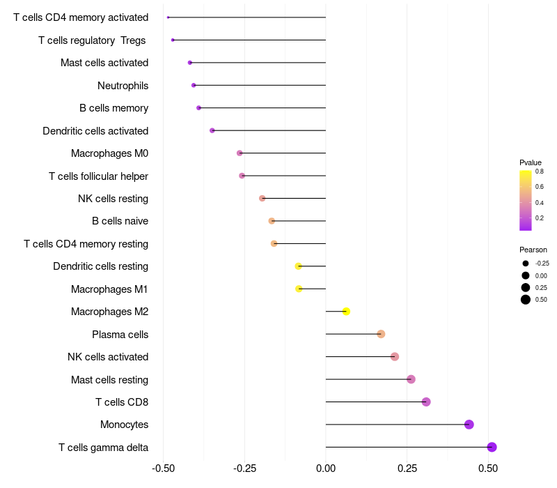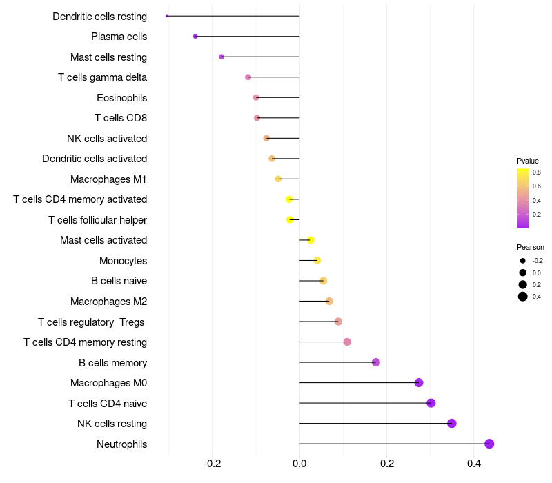 Lollipop of PRDM8 expression and immune infiltrating cell level correlation result in HPV+ samples