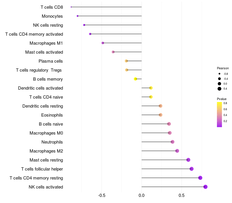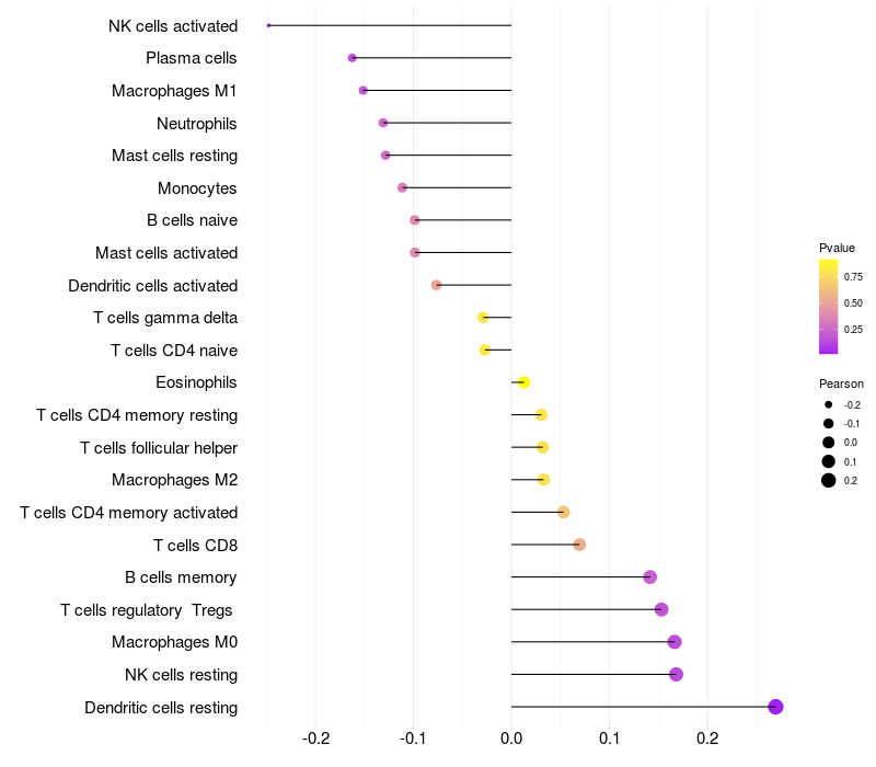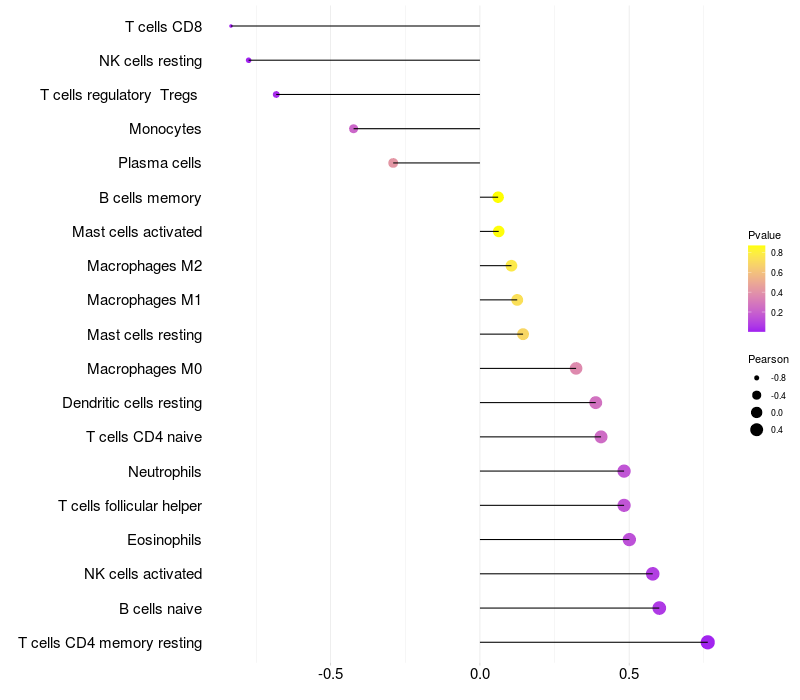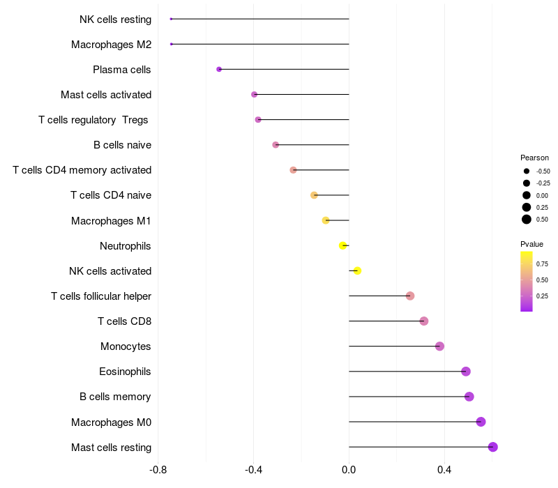Lollipop of PRDX1 expression and immune infiltrating cell level correlation result in HBV+ Liver cirrhosis samples