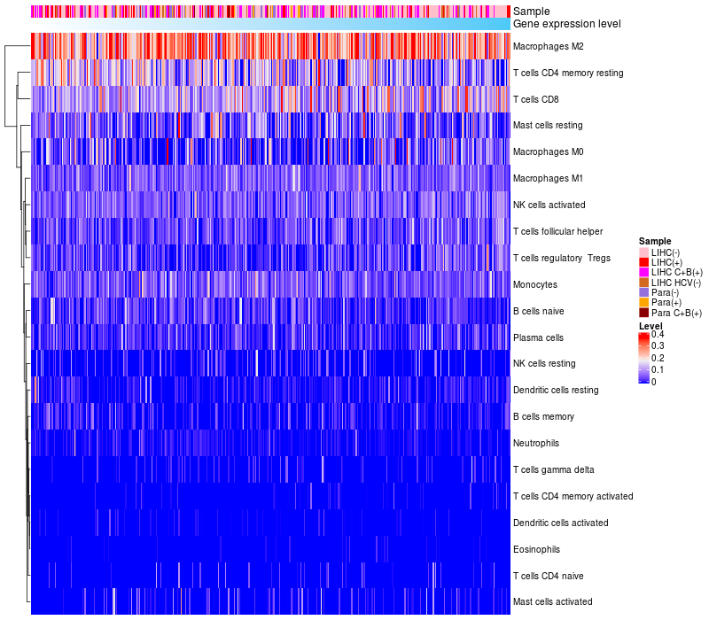 Liver hepatocellular carcinoma HCV (HBV+)(86), Liver hepatocellular carcinoma HCV (HBV-)(19), Liver hepatocellular carcinoma (HBV+)(209), Liver hepatocellular carcinoma (HBV+)(60), Paracancerous HCV (HBV+)(4), Paracancerous (HBV-)(28), Paracancerous (HBV+)(18) |