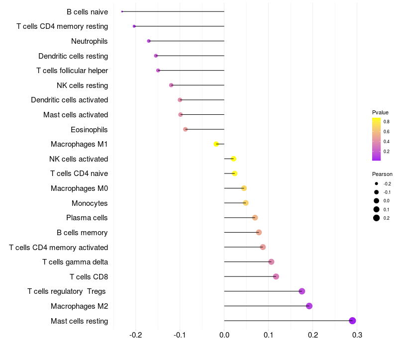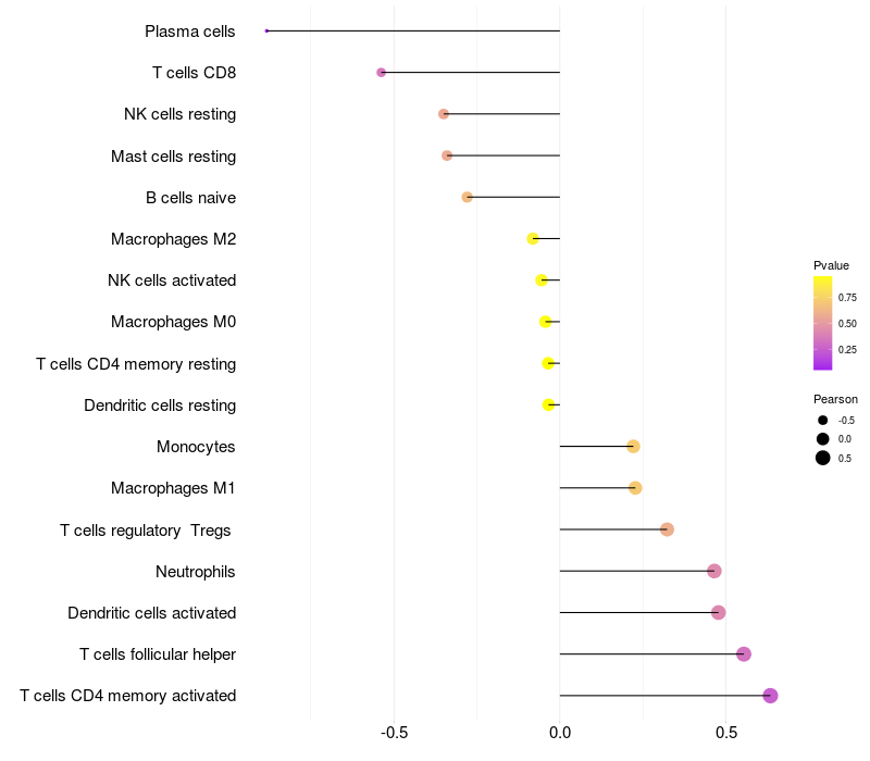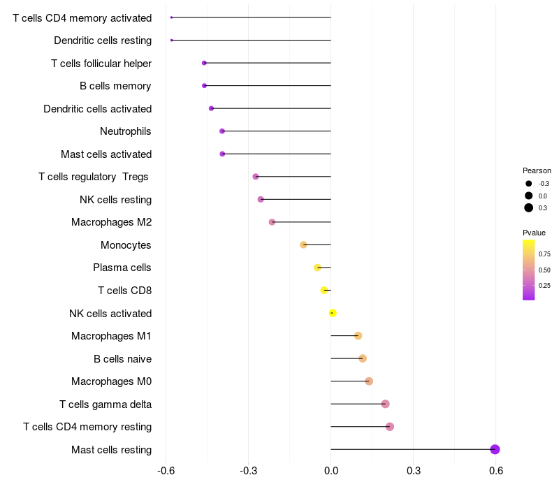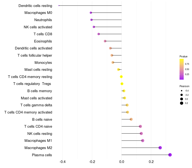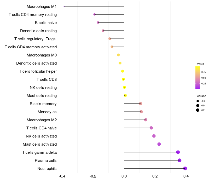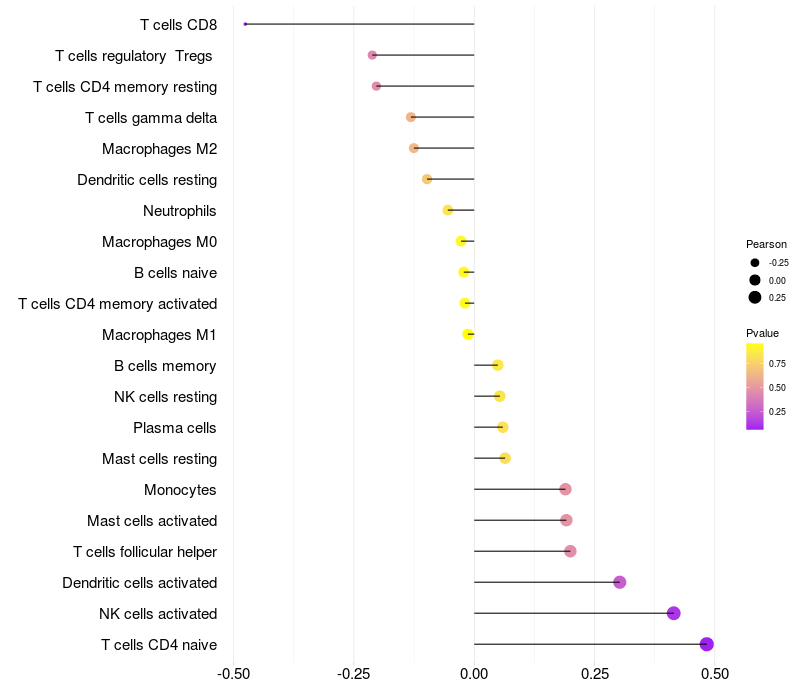 Lollipop of PREB expression and immune infiltrating cell level correlation result in HPV+ samples