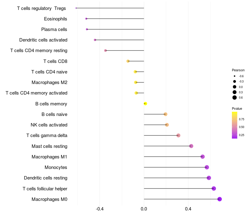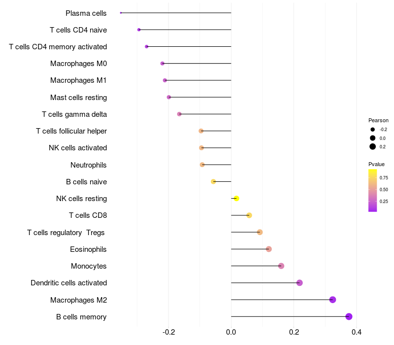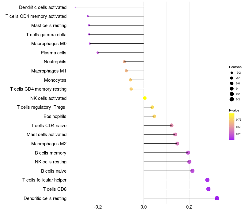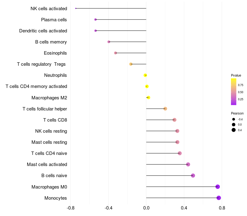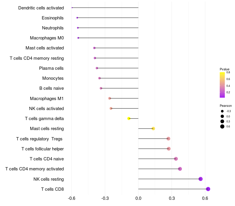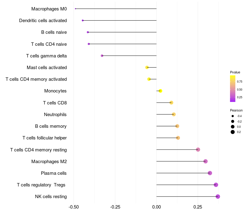 Lollipop of PRKAR1B expression and immune infiltrating cell level correlation result in EBV+ samples
