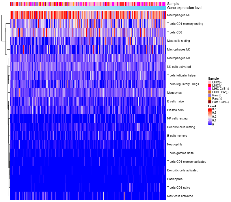Liver hepatocellular carcinoma HCV (HBV+)(86), Liver hepatocellular carcinoma HCV (HBV-)(19), Liver hepatocellular carcinoma (HBV+)(209), Liver hepatocellular carcinoma (HBV+)(60), Paracancerous HCV (HBV+)(4), Paracancerous (HBV-)(28), Paracancerous (HBV+)(18) |