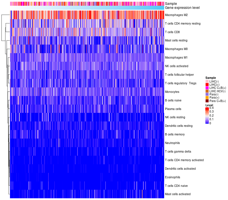 Liver hepatocellular carcinoma HCV (HBV+)(86), Liver hepatocellular carcinoma HCV (HBV-)(19), Liver hepatocellular carcinoma (HBV+)(209), Liver hepatocellular carcinoma (HBV+)(60), Paracancerous HCV (HBV+)(4), Paracancerous (HBV-)(28), Paracancerous (HBV+)(18) |
