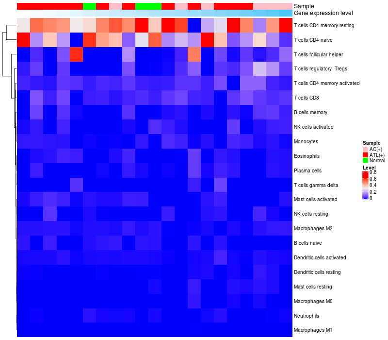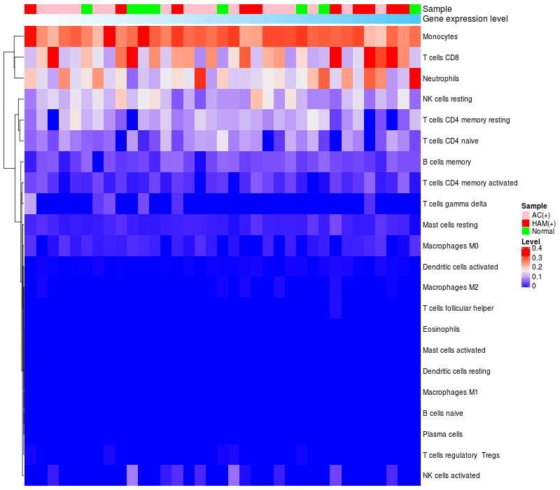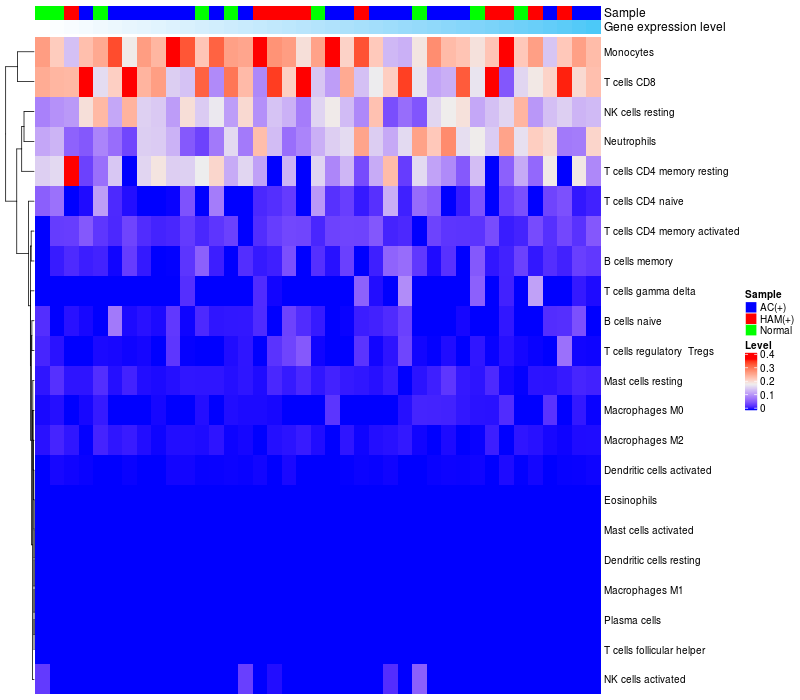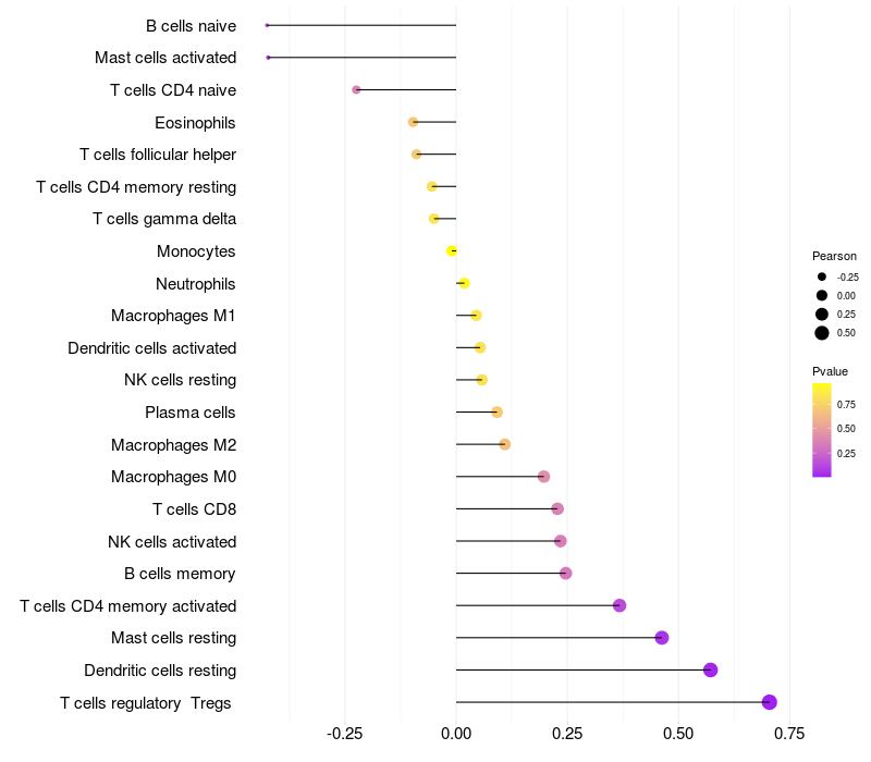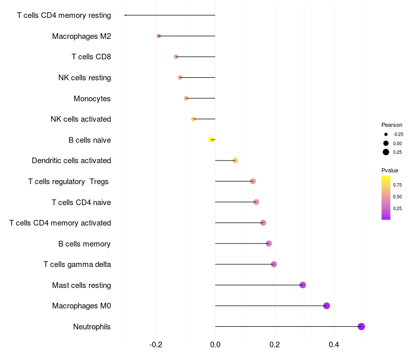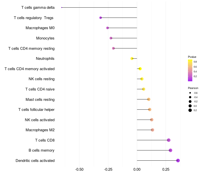 Lollipop of PRKD2 expression and immune infiltrating cell level correlation result in HTLV1+ samples