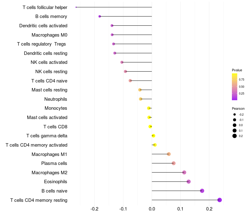 Lollipop of PRKG1 expression and immune infiltrating cell level correlation result in HBV+ samples