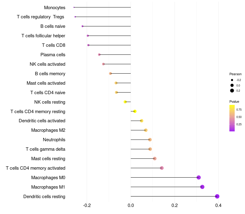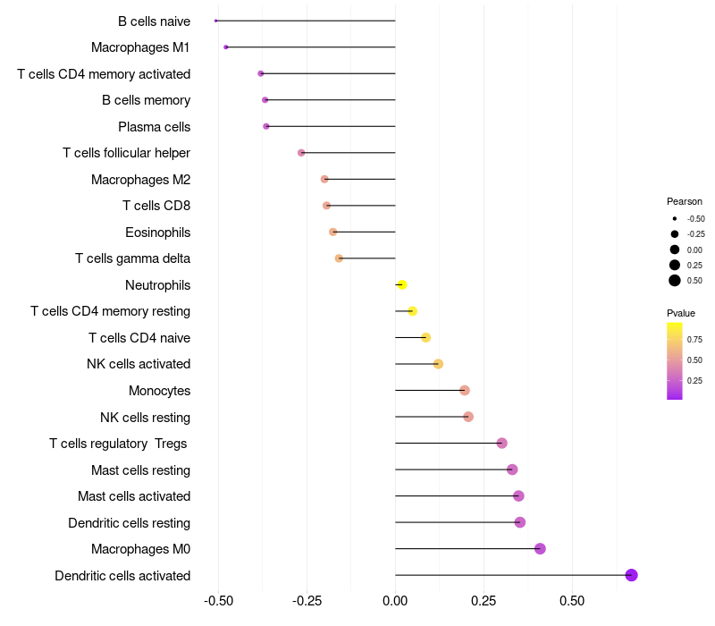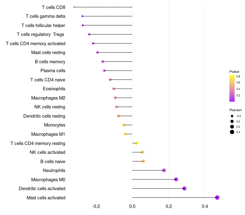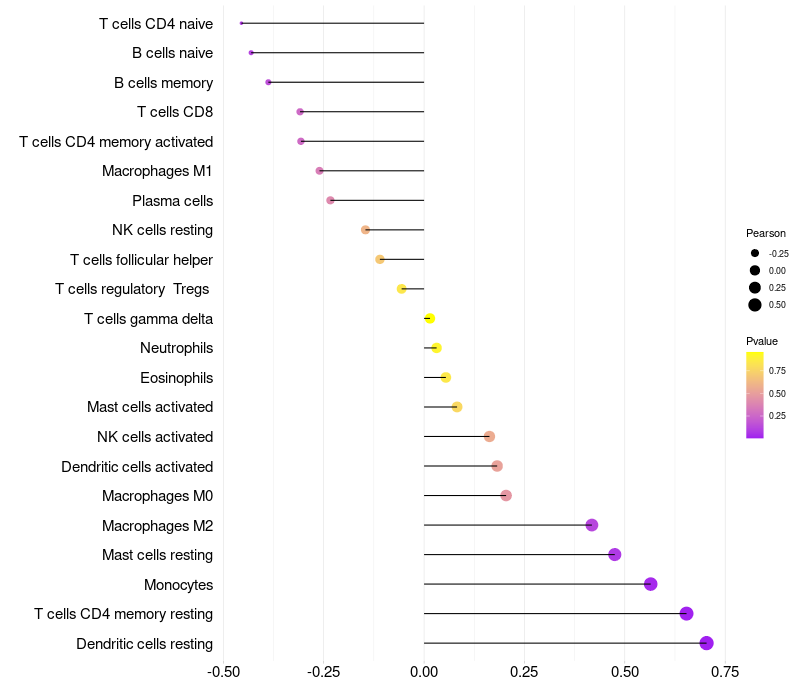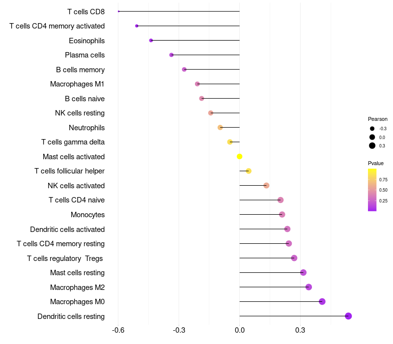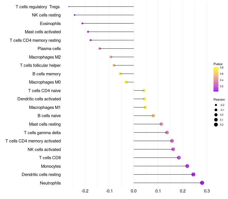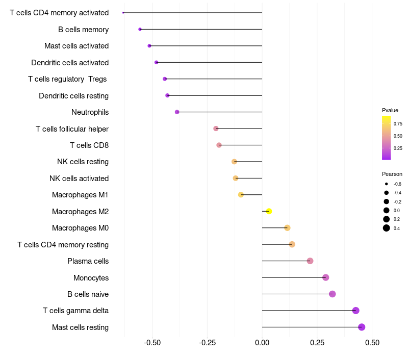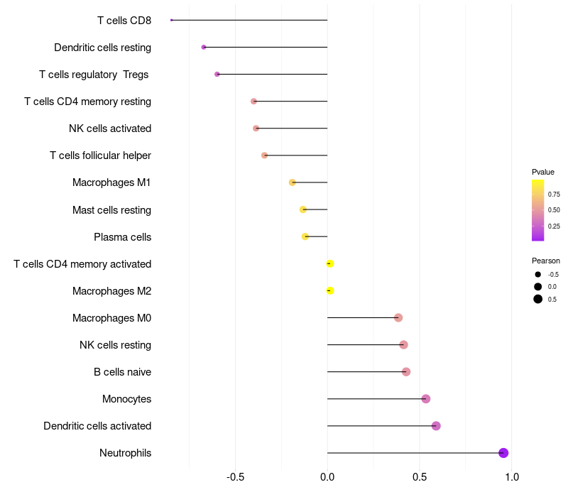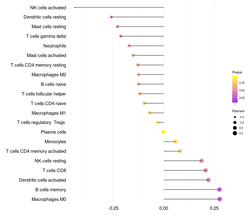 Lollipop of PRNP expression and immune infiltrating cell level correlation result in HPV+ samples