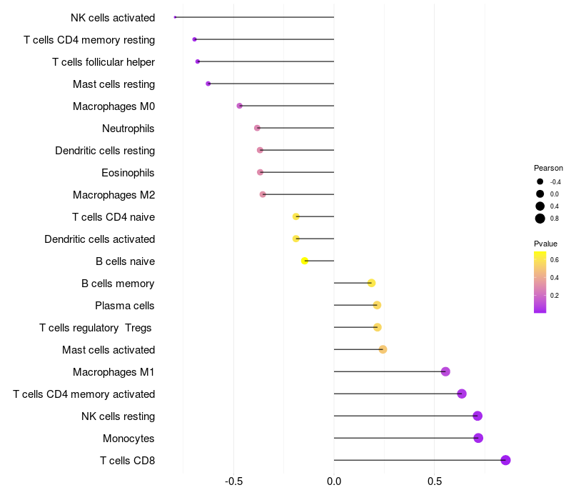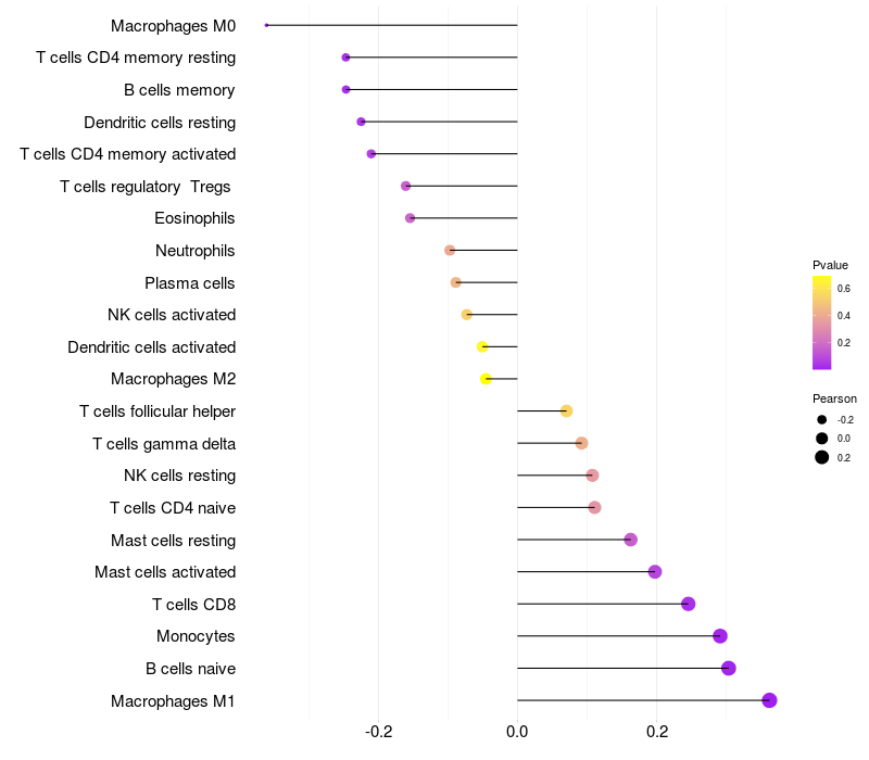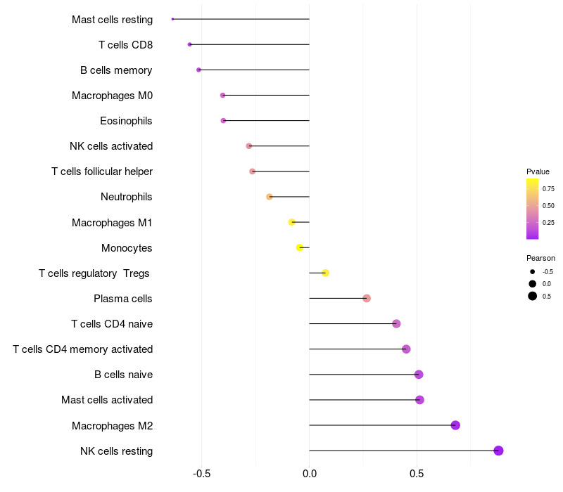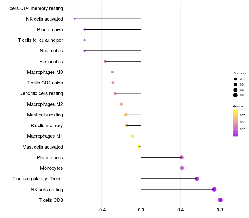 Lollipop of PROC expression and immune infiltrating cell level correlation result in HBV+ Liver cirrhosis samples