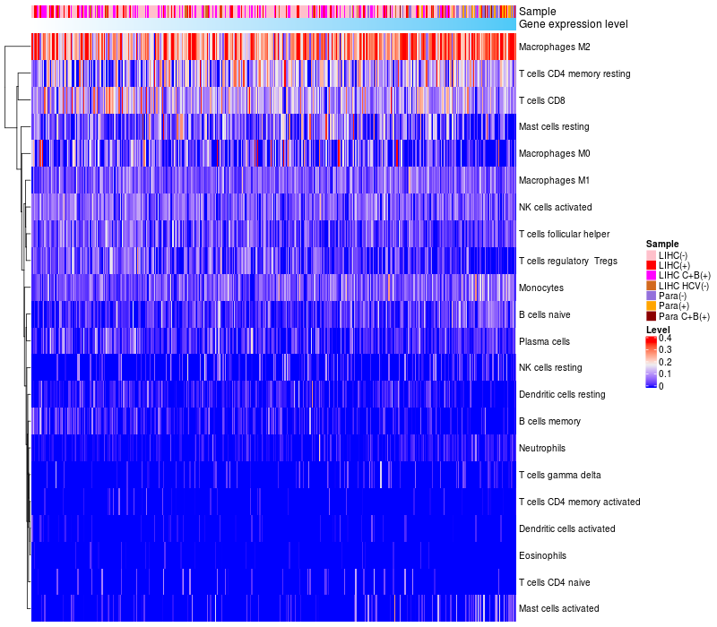 Liver hepatocellular carcinoma HCV (HBV+)(86), Liver hepatocellular carcinoma HCV (HBV-)(19), Liver hepatocellular carcinoma (HBV+)(209), Liver hepatocellular carcinoma (HBV+)(60), Paracancerous HCV (HBV+)(4), Paracancerous (HBV-)(28), Paracancerous (HBV+)(18) |