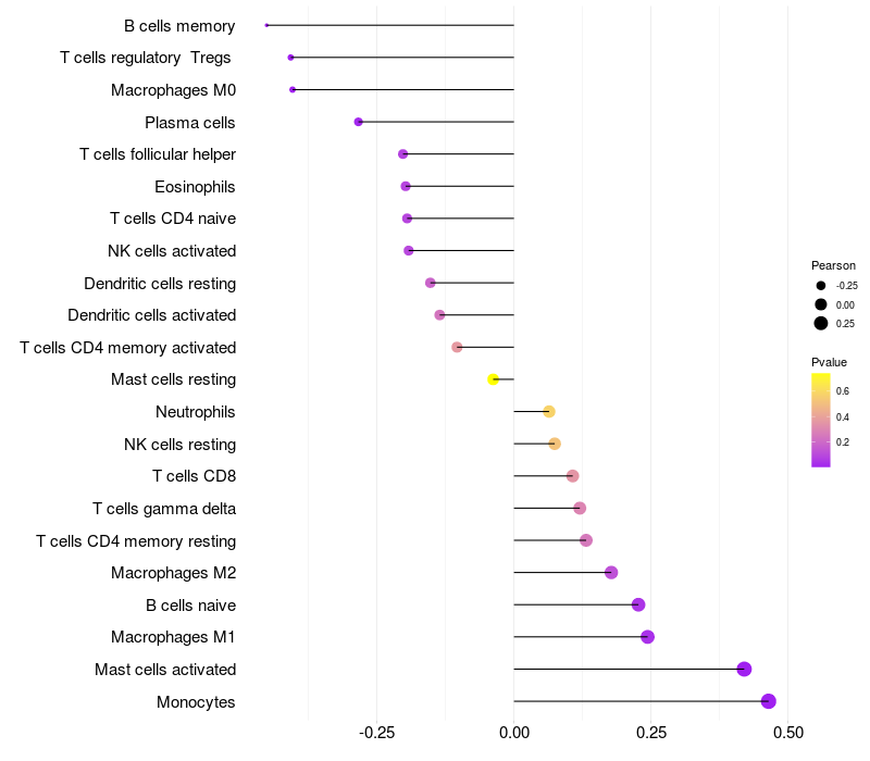 Lollipop of PROS1 expression and immune infiltrating cell level correlation result in HBV+ samples