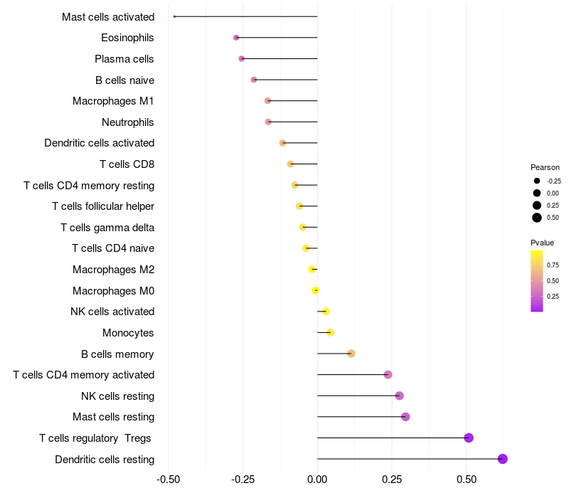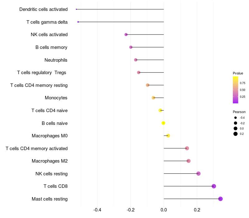Lollipop of PROZ expression and immune infiltrating cell level correlation result in HTLV1+ samples
