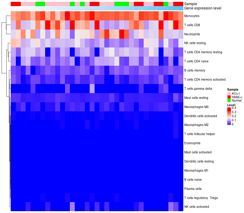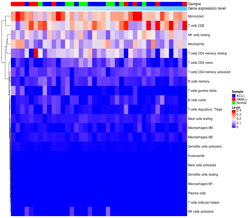 Normal (8), Asymptomatic carriers (HTLV1+)(17), HTLV-1-associated myelopathy (HTLV1+)(10) |