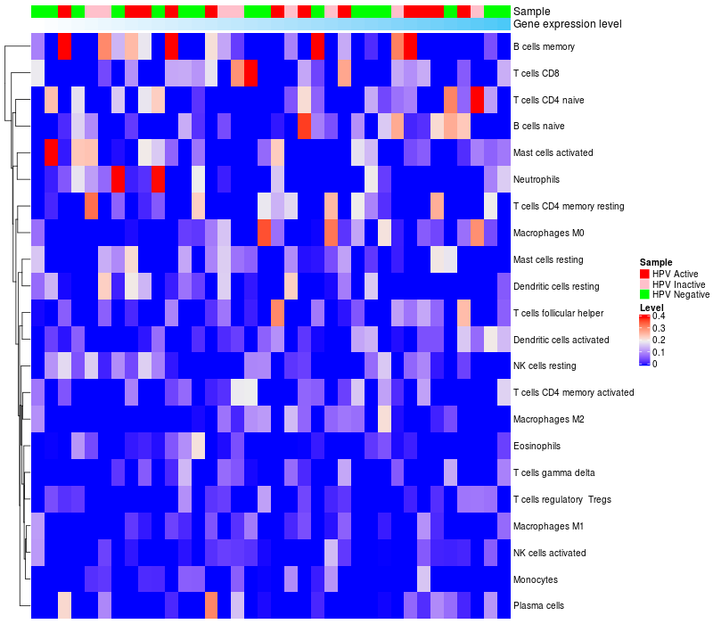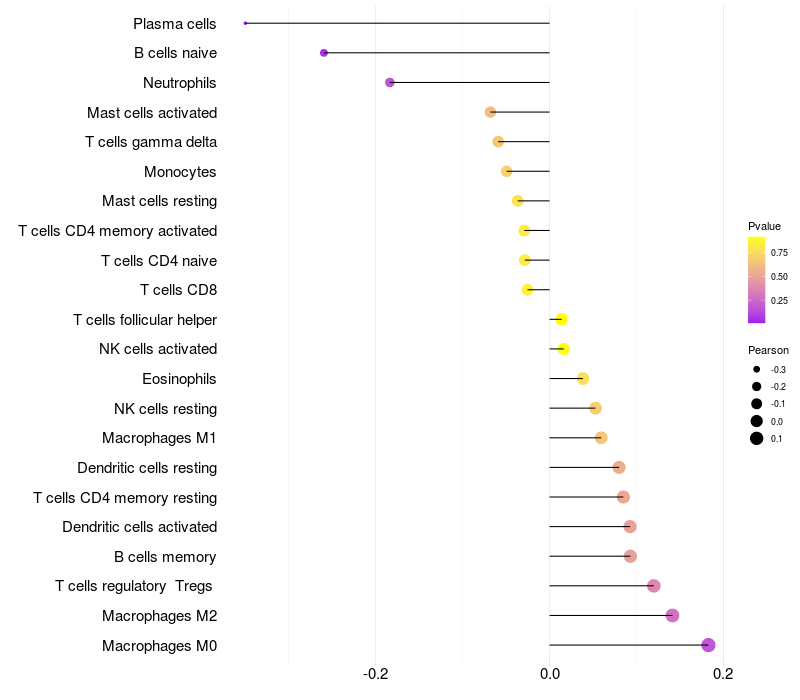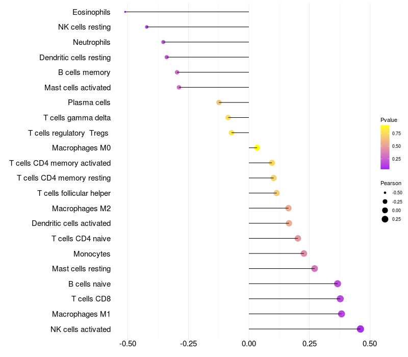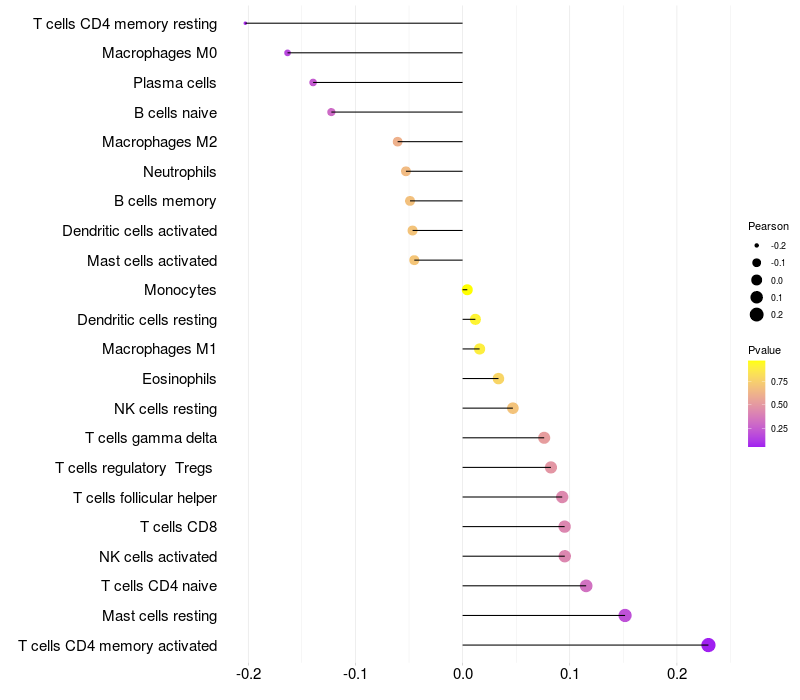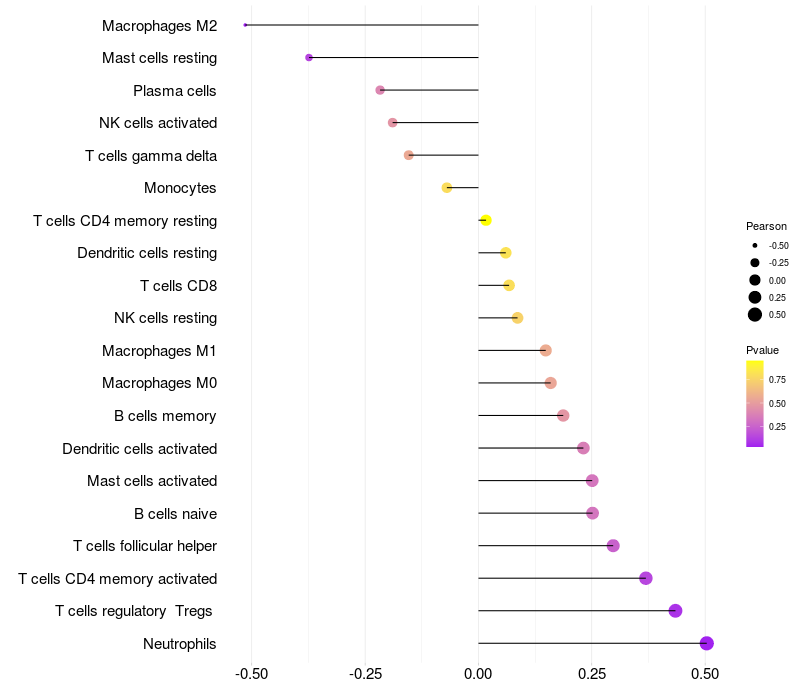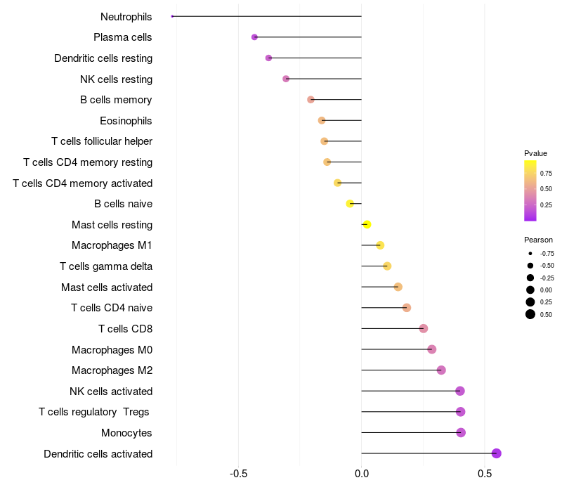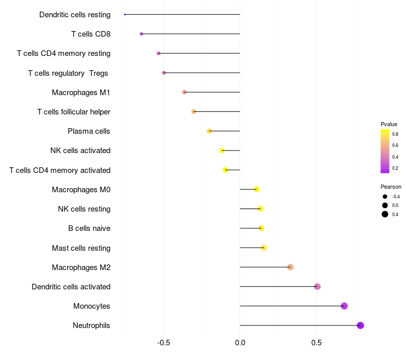 Lollipop of PRPF19 expression and immune infiltrating cell level correlation result in HPV+ samples