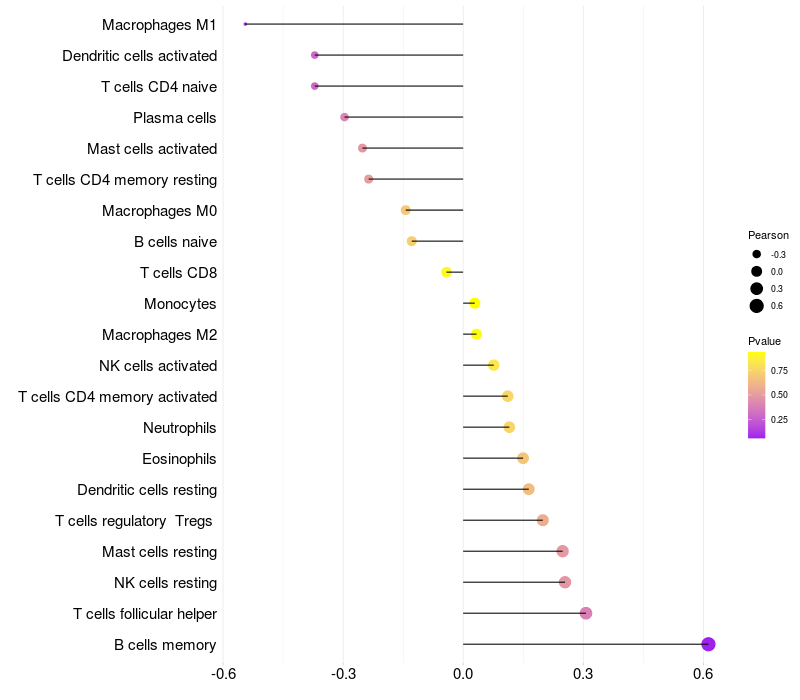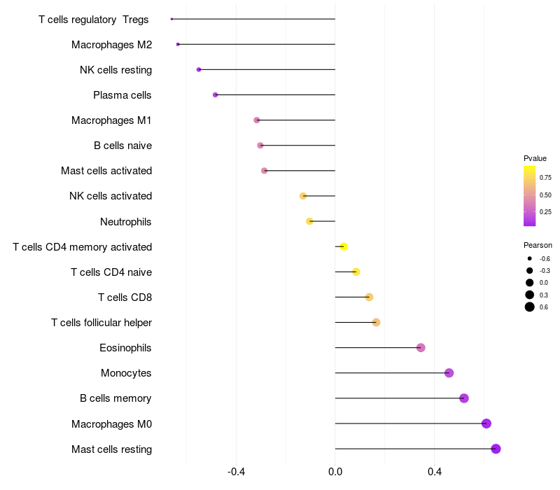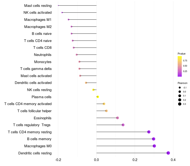 Lollipop of PRPF38A expression and immune infiltrating cell level correlation result in HBV+ Chronic HBV (CHB) infection samples