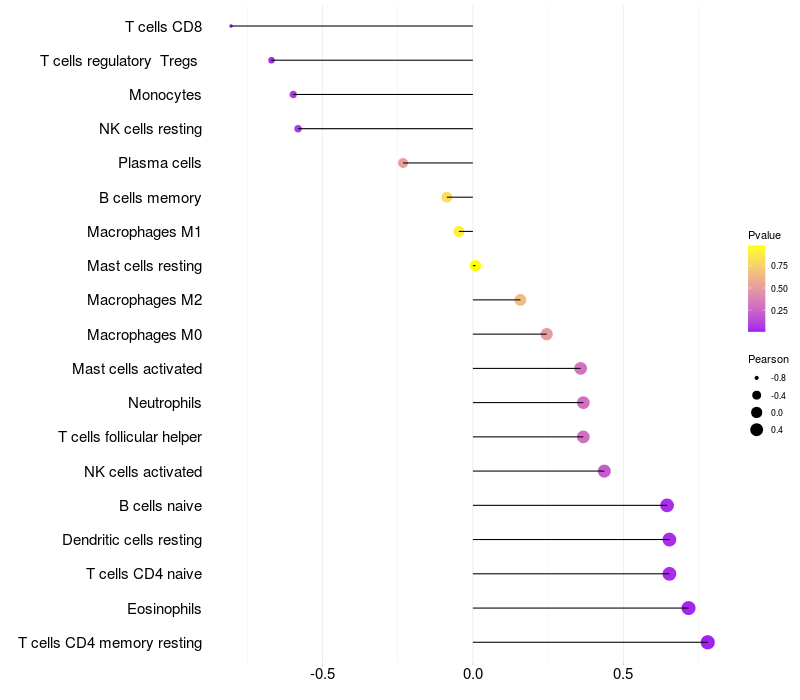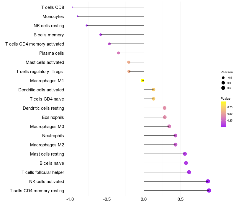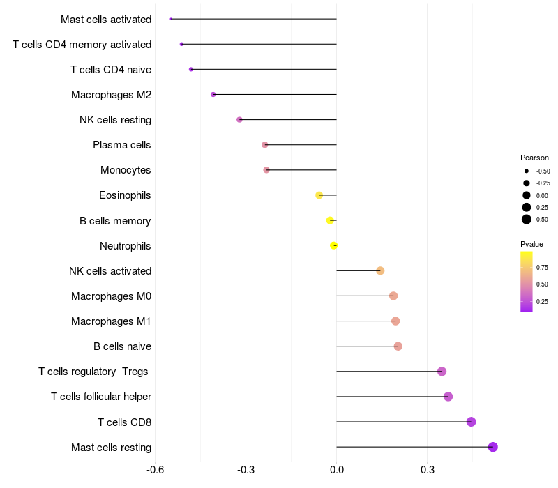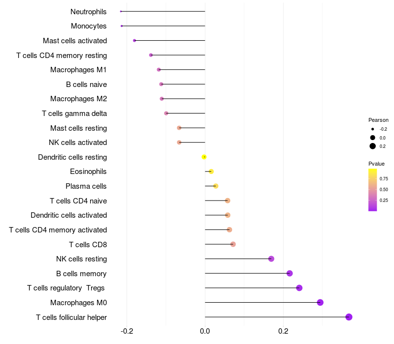 Lollipop of PRPF6 expression and immune infiltrating cell level correlation result in HBV+ Liver cirrhosis samples