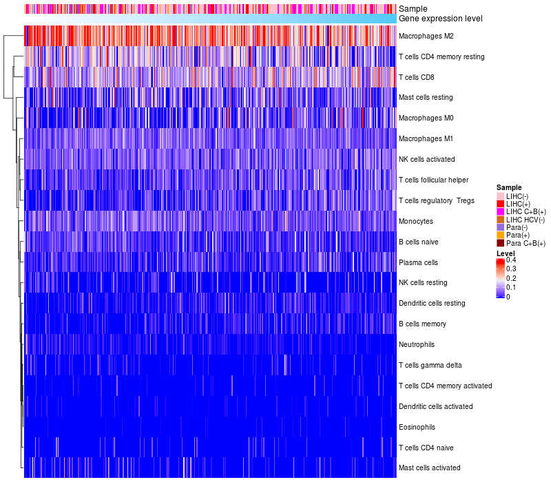 Liver hepatocellular carcinoma HCV (HBV+)(86), Liver hepatocellular carcinoma HCV (HBV-)(19), Liver hepatocellular carcinoma (HBV+)(209), Liver hepatocellular carcinoma (HBV+)(60), Paracancerous HCV (HBV+)(4), Paracancerous (HBV-)(28), Paracancerous (HBV+)(18) |