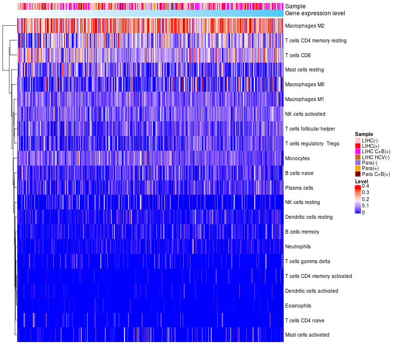 Liver hepatocellular carcinoma HCV (HBV+)(86), Liver hepatocellular carcinoma HCV (HBV-)(19), Liver hepatocellular carcinoma (HBV+)(209), Liver hepatocellular carcinoma (HBV+)(60), Paracancerous HCV (HBV+)(4), Paracancerous (HBV-)(28), Paracancerous (HBV+)(18) |